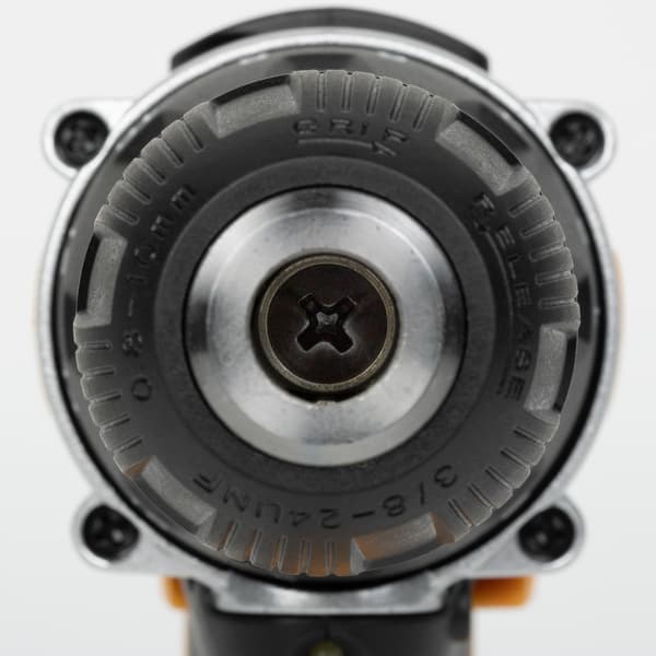 В шуруповерте нет механизма блокировки шпинделя. Это минус, но следует помнить о цене инструмента. Патрон крепится к валу болтом с крестовой шляпкой и обратной (левой) резьбой. Демонтировать патрон несложно: сначала нужно вывинтить внутренний винт, легкими постукиваниями ослабить патрон, после чего его можно будет отвинтить.