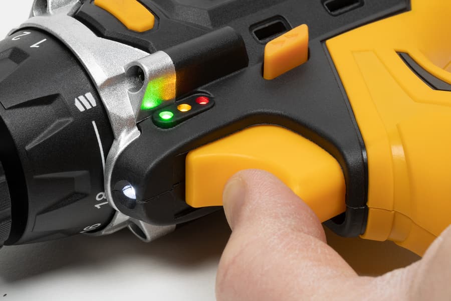 Рычаг пуска нажимается со средним усилием и имеет ход 8 мм. Первые 2 мм хода — холостые, как принято во всех шуруповертах, при чуть большем нажатии включается фонарик и индикаторы заряда, а на глубине хода 2,5-3 мм включается мотор. Таким образом, на регулировку скорости вращения шпинделя производитель оставляет 5 мм хода рычага.