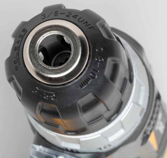 Автоматическая блокировка шпинделя отсутствует, поэтому применен двухмуфтовый патрон. Это означает, что при установке биты или сверла потребуются две руки: первая удерживает заднюю муфту, а второй рукой закручивается передняя. Конечно, это не так удобно, как с блокировкой и быстрозажимным одномуфтовым патроном, но за такую цену можно и потерпеть.