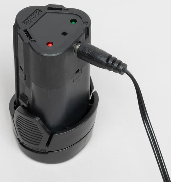 Емкость батареи составляет 1500 мА·ч. Много это или мало? Увидим (нас ожидает сюрприз). Зарядить аккумулятор можно, вынув его из рукояти и подсоединив штекер адаптера к соответствующему разъему, который расположен в верхней части корпуса батареи. Здесь, на верхнем торце аккумулятора, находятся два светодиодных индикатора: красный светится в процессе зарядки, а светящийся зеленый сигнализирует о полном заряде батареи.