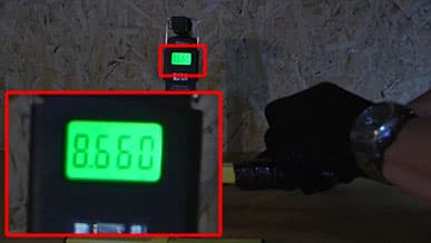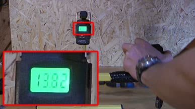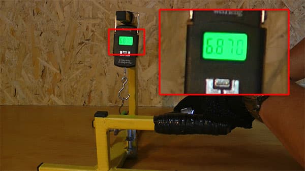 После нескольких неудачных попыток и двух поломанных безменов (нельзя подавать на весы ударный момент!) наконец-то был найден оптимальный способ измерения крутящего момента на нашем стенде. Вот они, простые приемы: включить режим сверления на 1-й скорости и, крепко прижав рукоять к поперечине стенда (она специально для этого и предназначена), плавно нажать включатель и удерживать его в нажатом состоянии несколько секунд, пока шуруповерт не сбросит мощность. За постоянно меняющимися значениями электронных весов следить бесполезно, тут поможет только видеокамера, снимающая с высокой частотой кадров. Впоследствии, при изучении снятого видео, нетрудно отыскать кадр, в котором запечатлено максимальное значение. Вот оно.