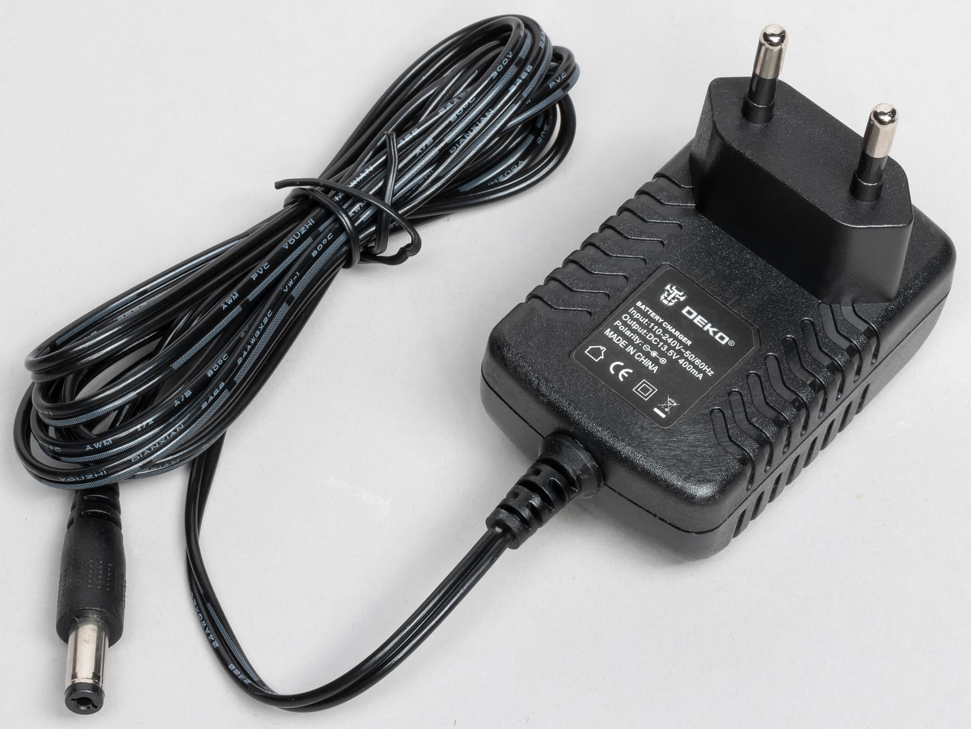 Как мы уже убедились, энергии, которую хранит аккумулятор, хватает на полчаса довольно интенсивной работы. И все бы хорошо, но есть один серьезный недостаток: зарядка длится долго. Нет, не так: очень долго. Производитель в данном случае честно указал эту длительность: 3 часа. Почему так? А вот почему: прилагаемый адаптер питания выдает 13,5 В со смехотворной силой тока 400 мА.