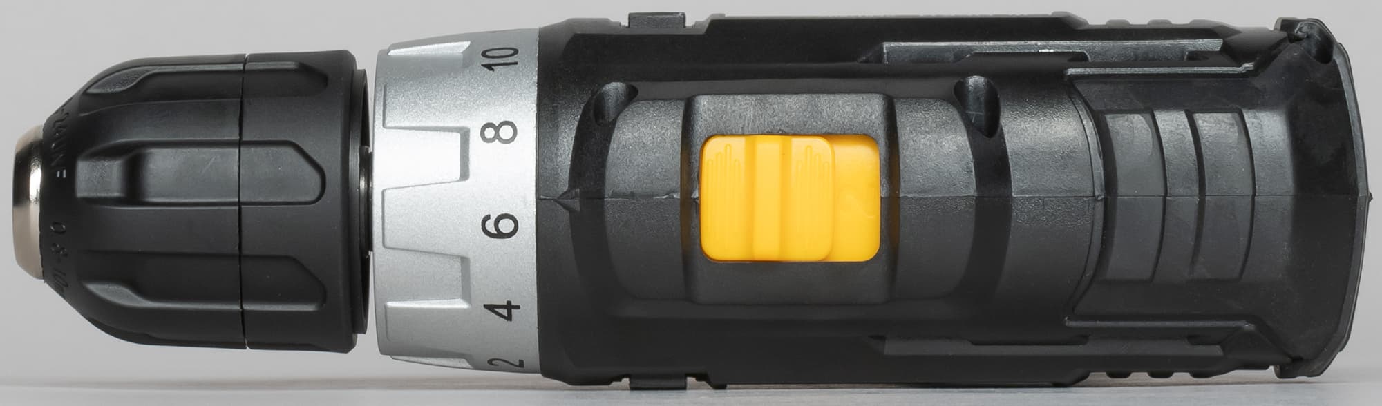 Ползунок переключателя скоростей расположен наверху, сдвигается он при значительном усилии, издавая яркий щелчок. Выдавленные в оранжевом пластике цифры 1 и 2 практически невидимы, но это можно исправить: достаточно замазать их каким-нибудь лаком для ногтей, который наверняка отыщется у обладательницы шуруповерта.