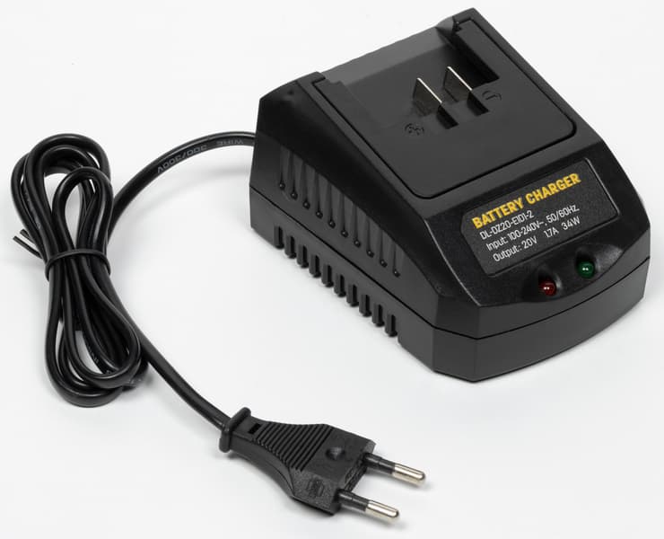 Прилагаемое зарядное устройство представляет собой станцию на 100—240 В с выходом 20 В/2,0 А. Батарея полозьями вставляется в слот и фиксируется в нем так же, как в подошве шуруповерта. Во время зарядки светится красный светодиод, а по завершении зарядки включается зеленый.