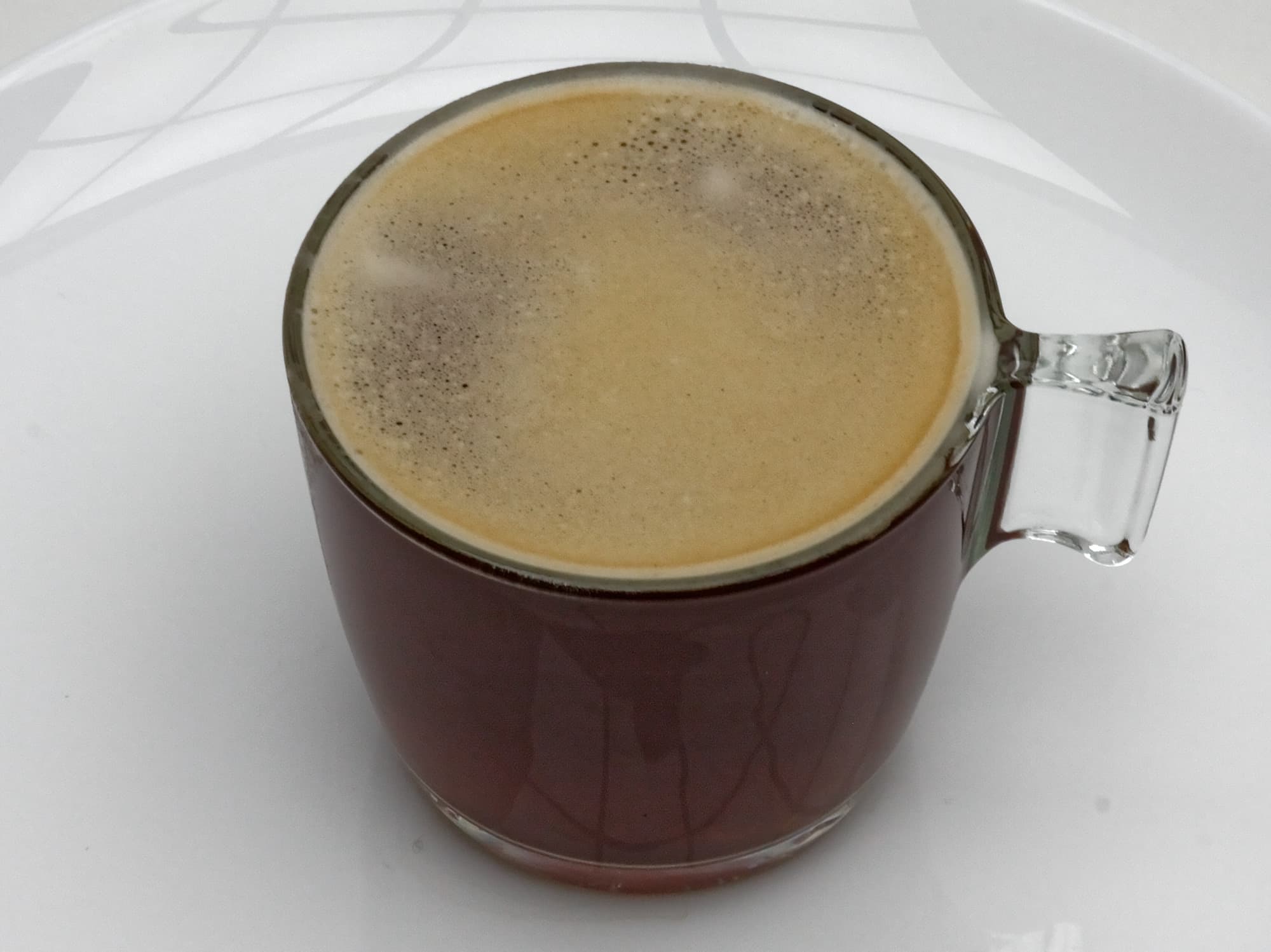 Наконец, взглянем на режим «большой чашки». Сколько кофе приготовит наша машинка за один раз? На фото ниже — стандартная чашка из Икеи емкостью 230 мл. Как мы видим, режим «двойной большой чашки» наполнил ее до краев.