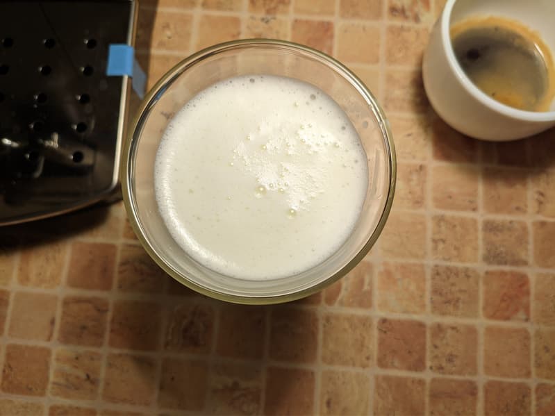 Классический эспрессо получается отличным (собственно, качество напитка тут будет то же самое, как и в других моделях, основанных на платформе ECAM). Машина предсмачивает кофе в течение 1 секунды, после чего выдает 40 мл напитка с симпатичной пенкой крема. На максимальных настройках крепости у нас получилось 31 грамм напитка.