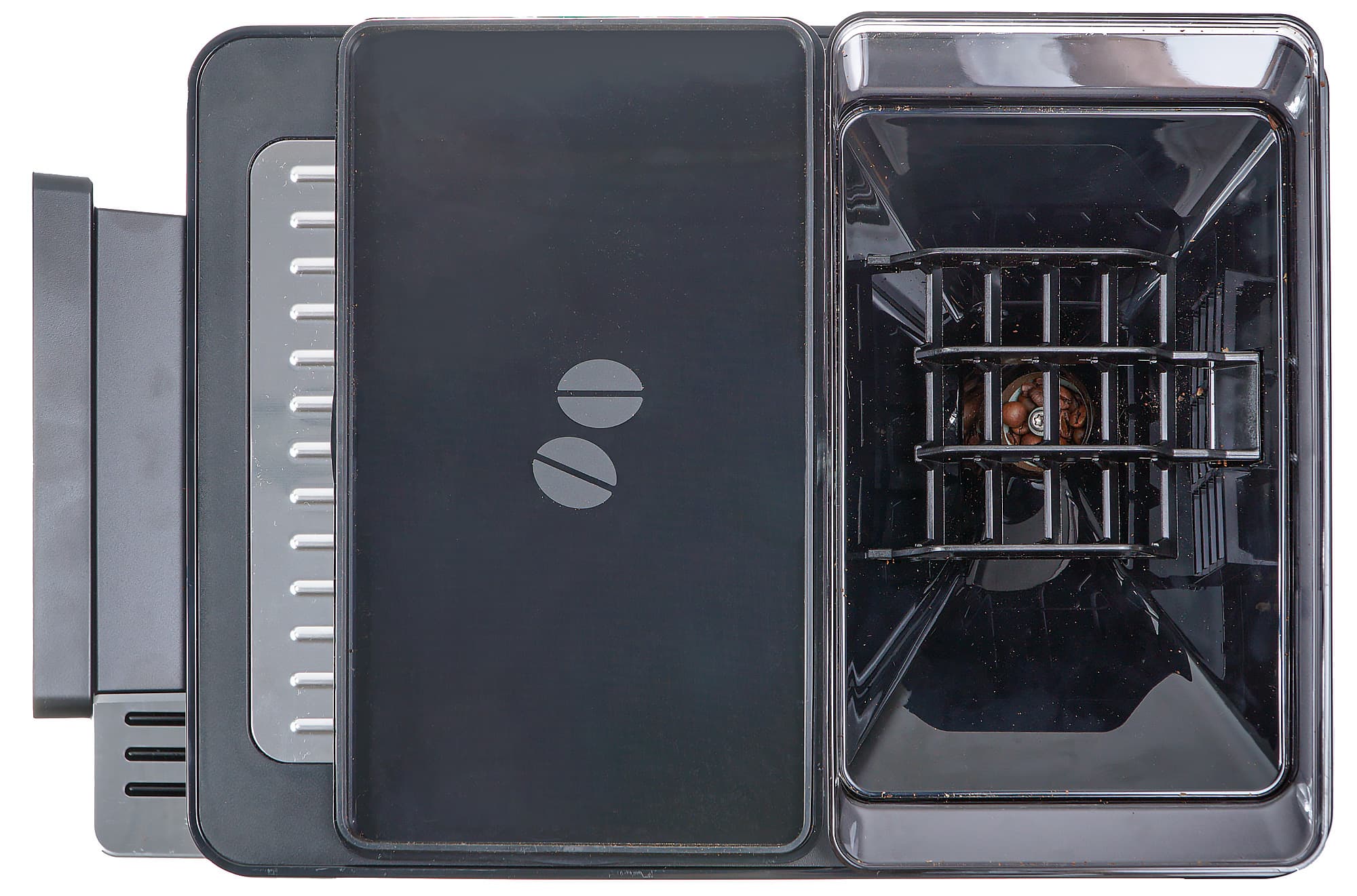 Сверху также расположен поддон для чашек и объемный отсек для зернового кофе, закрывающийся на металлическую крышку с плотным уплотнителем. Такое решение не только гасит шум от кофемолки, но также позволяет дольше сохранить свежесть зерен.