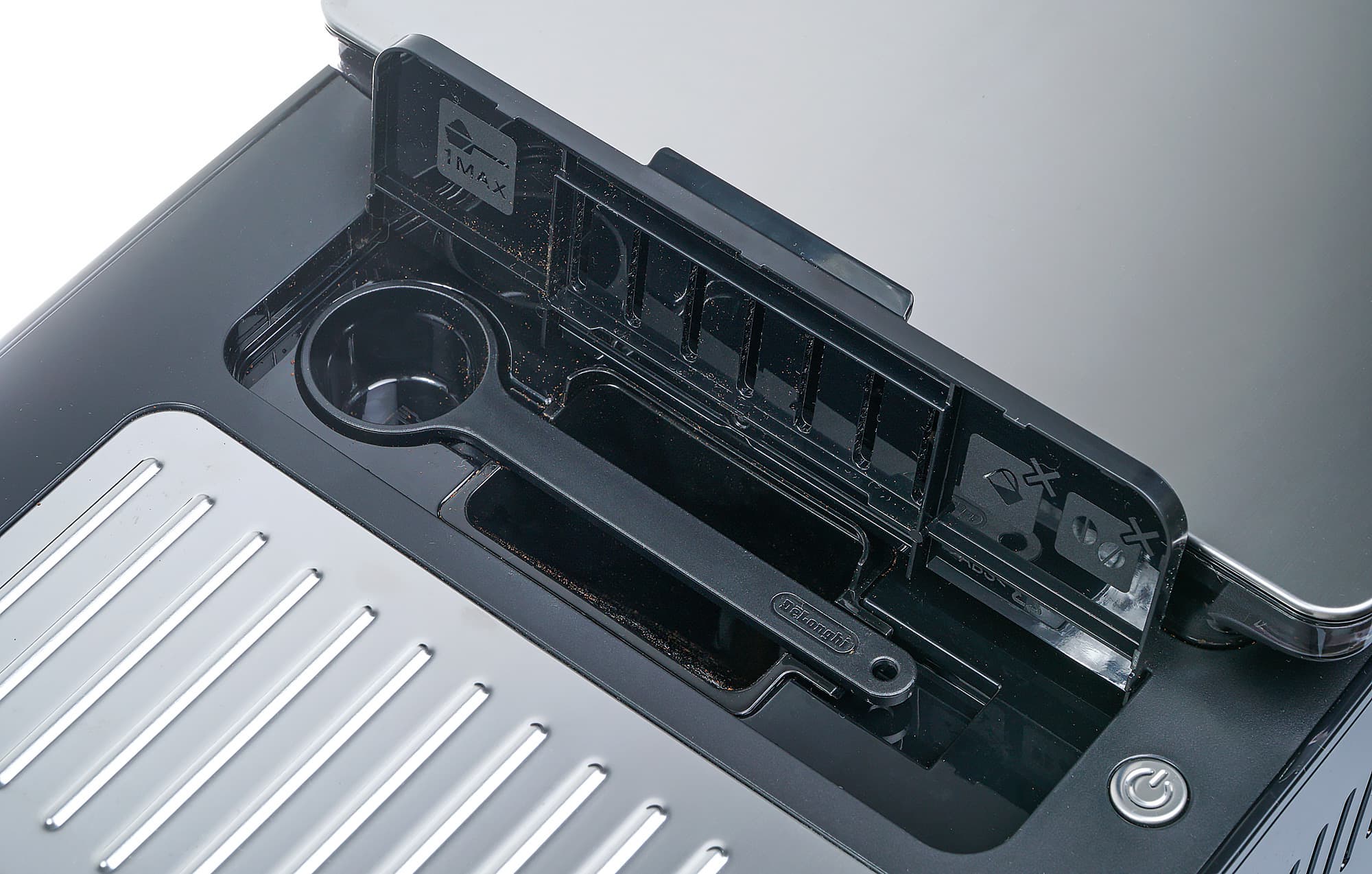 Контейнер для отходов вмещает около 18-20 порций (то есть, нам придется опустошать его в среднем после приготовления 18 напитков). Достается контейнер спереди, вместе с отсеком для сбора капель. Насколько часто придется выливать воду — зависит от того, какие напитки вы предпочитаете готовить чаще (капучинатор нельзя надолго оставлять без запуска очистки, иначе молоко засохнет, а это — дополнительный расход воды).