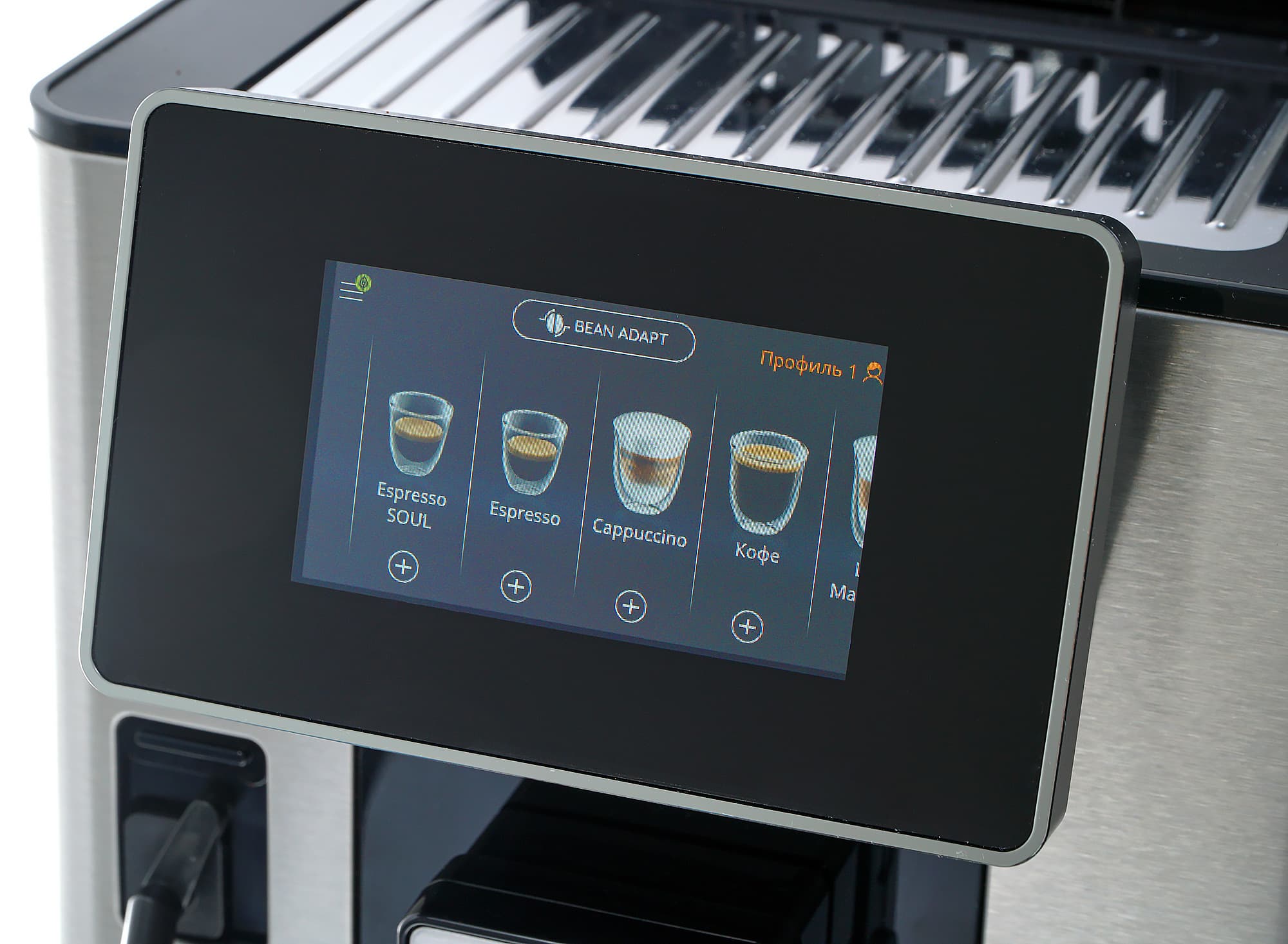 В плане «железа» тут не так много изменений по сравнению с младшими моделями. В первую очередь это, конечно, кофемолка с плоскими стальными жерновами и автоматической регулировкой степени помола, а из более заметного визуально — сенсорный экран с большей диагональю и вообще лучшего качества. Отметим также изменения типа съемного диспенсера, увеличенный бак для воды и специальный отсек для мерной ложки. Все они радуют и создают отчетливое впечатление, что пользоваться новой машиной удобнее, чем предыдущей. Остальные нововведения в данной модели касаются программной части: прибор стал гораздо дружелюбнее к новичкам и буквально «проведет за руку» для подбора оптимальных настроек машины в зависимости от сорта кофе. Особенно приятно, что настройки можно запомнить и вернуться к ним позже (это удобно, если у вас есть несколько любимых сортов кофе, которые вы хотите чередовать). Наличие настраиваемых пользовательских профилей и возможность изменения встроенных (и создания собственных) рецептов позволят настроить вкус различных напитков в полном соответствии с собственным вкусом. Ну а режим «Mug To Go» позволит настроить параметры любимого напитка для того, чтобы готовить целую кружку кофе в дорогу буквально в пару нажатий.