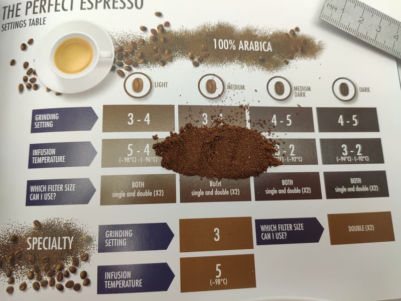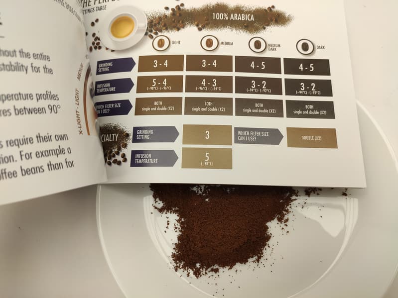 Наконец, покажем, с чего начинается подготовка к приготовлению напитка. Одна из брошюр, входящих в комплект, оснащена специальной таблицей, позволяющей визуально оценить тип кофе (степень прожарки) и подобрать наиболее подходящий для него помол.