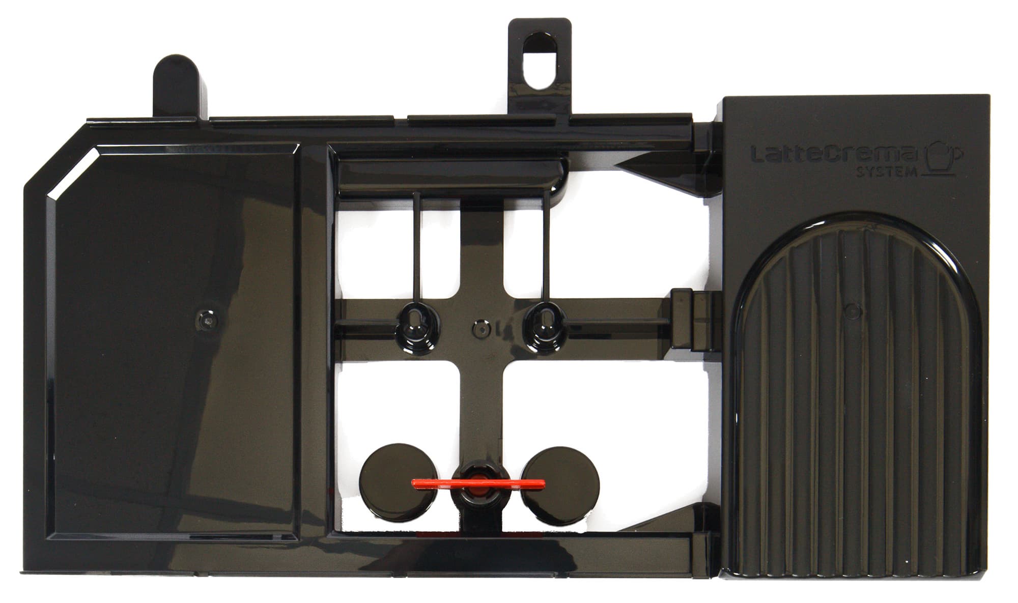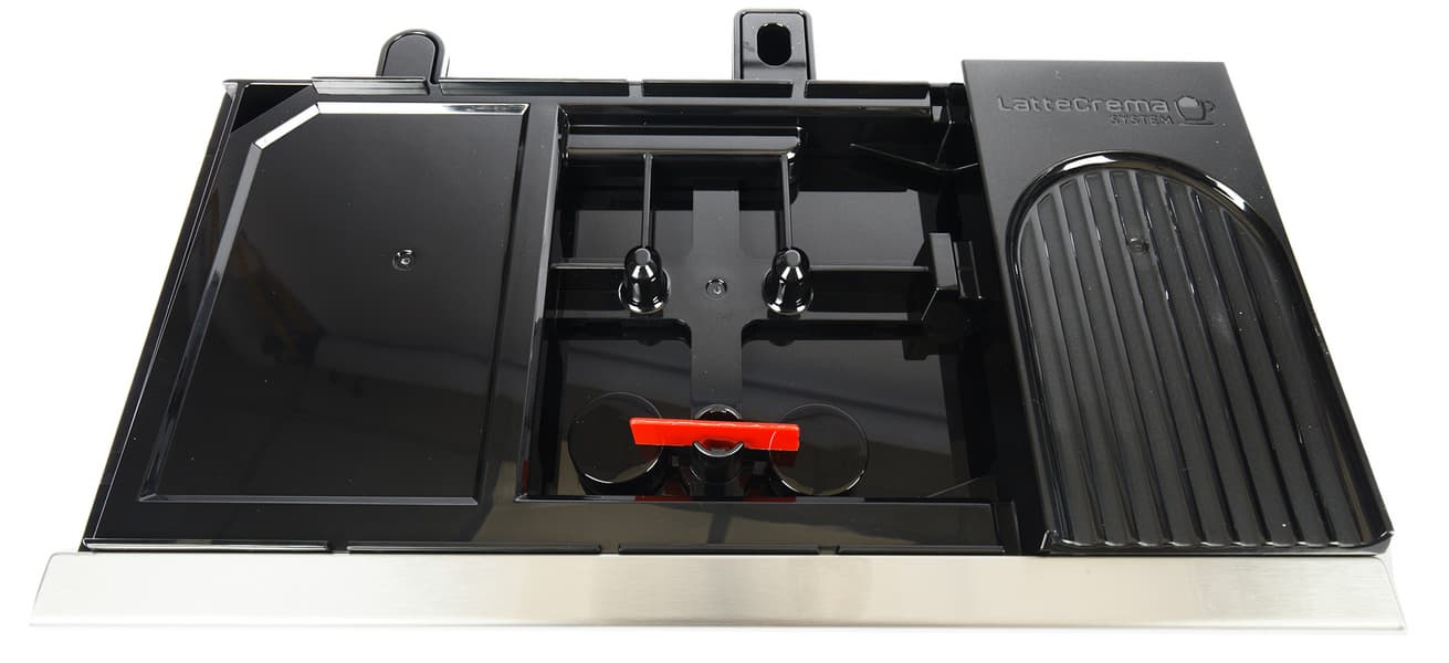 Между трубкой подачи пара и носика подачи горячей воды находится разъем для подключения LatteCrema System — автоматического капучинатора. Когда он не используется, разъем закрыт специальной накладкой (она же — приспособление для удаления накипи). Этих элементов у младшей модели нет, и мы рассмотрим их внимательнее.