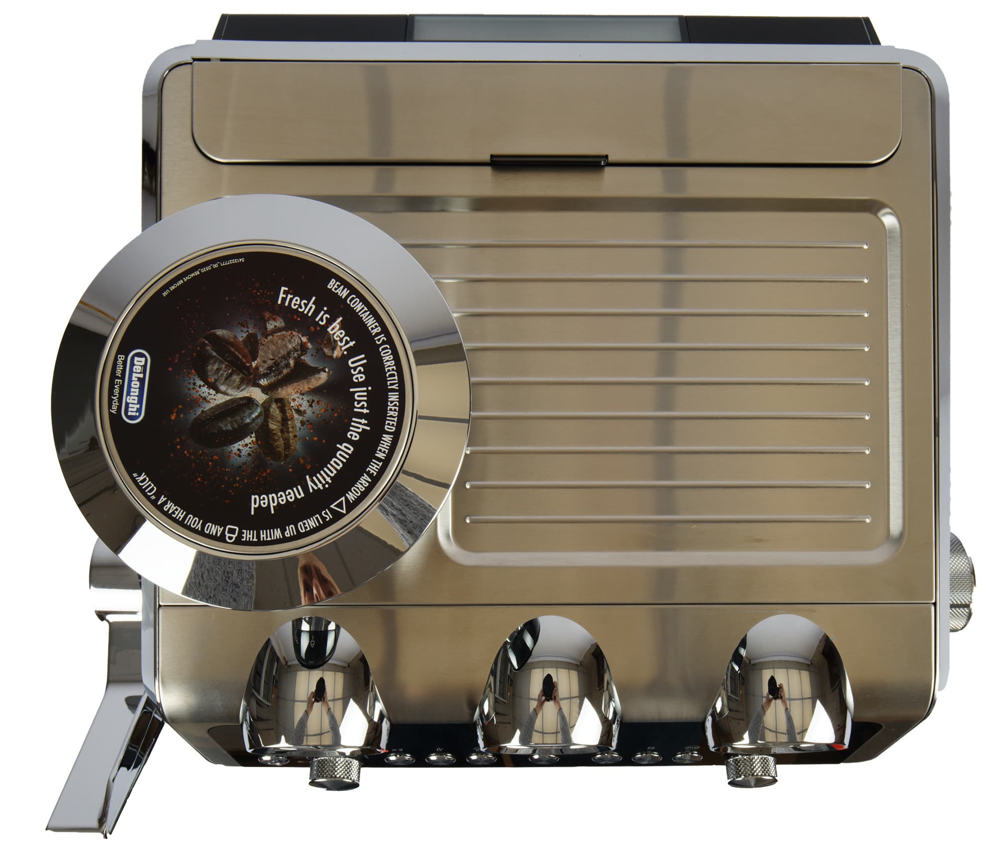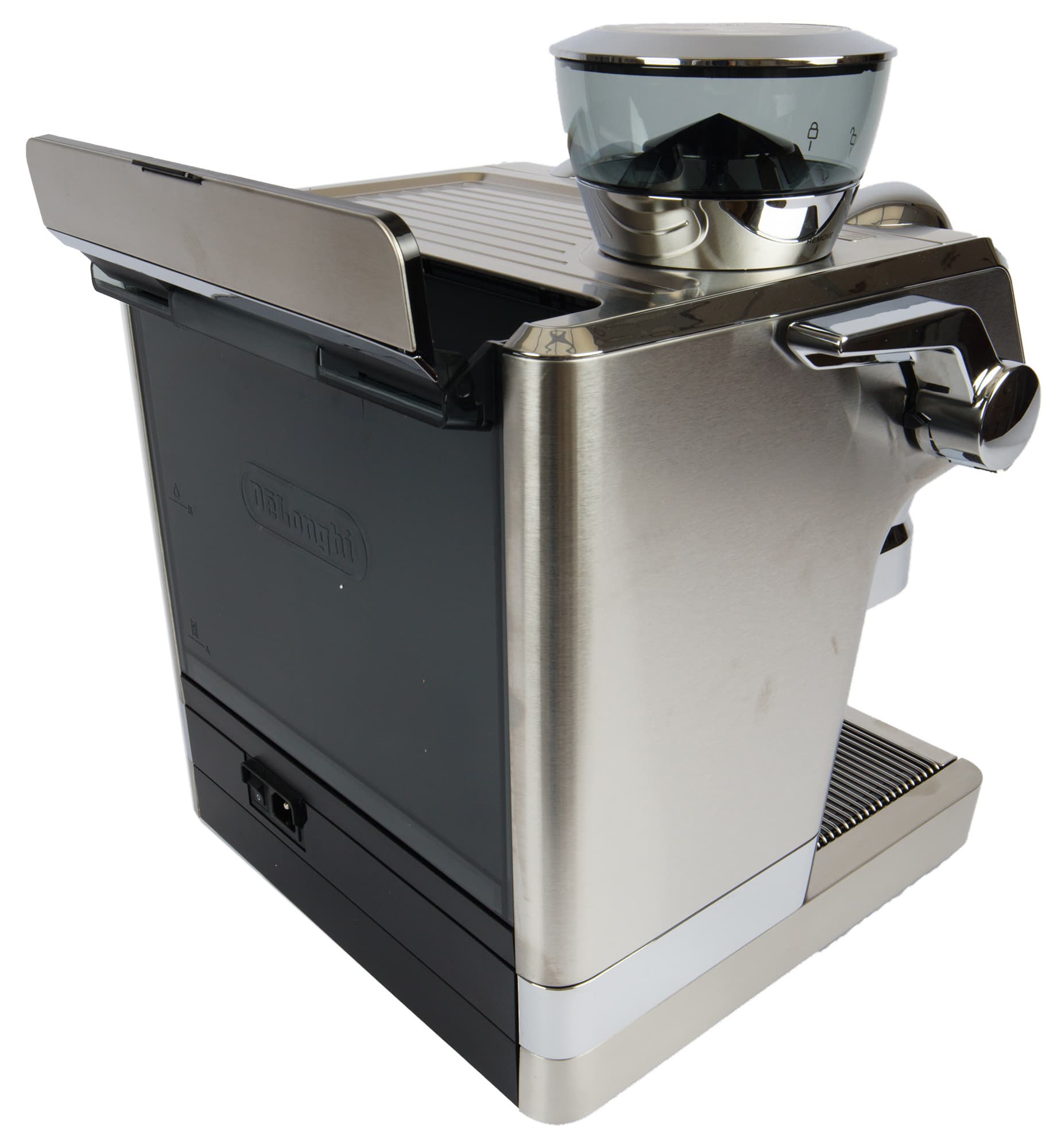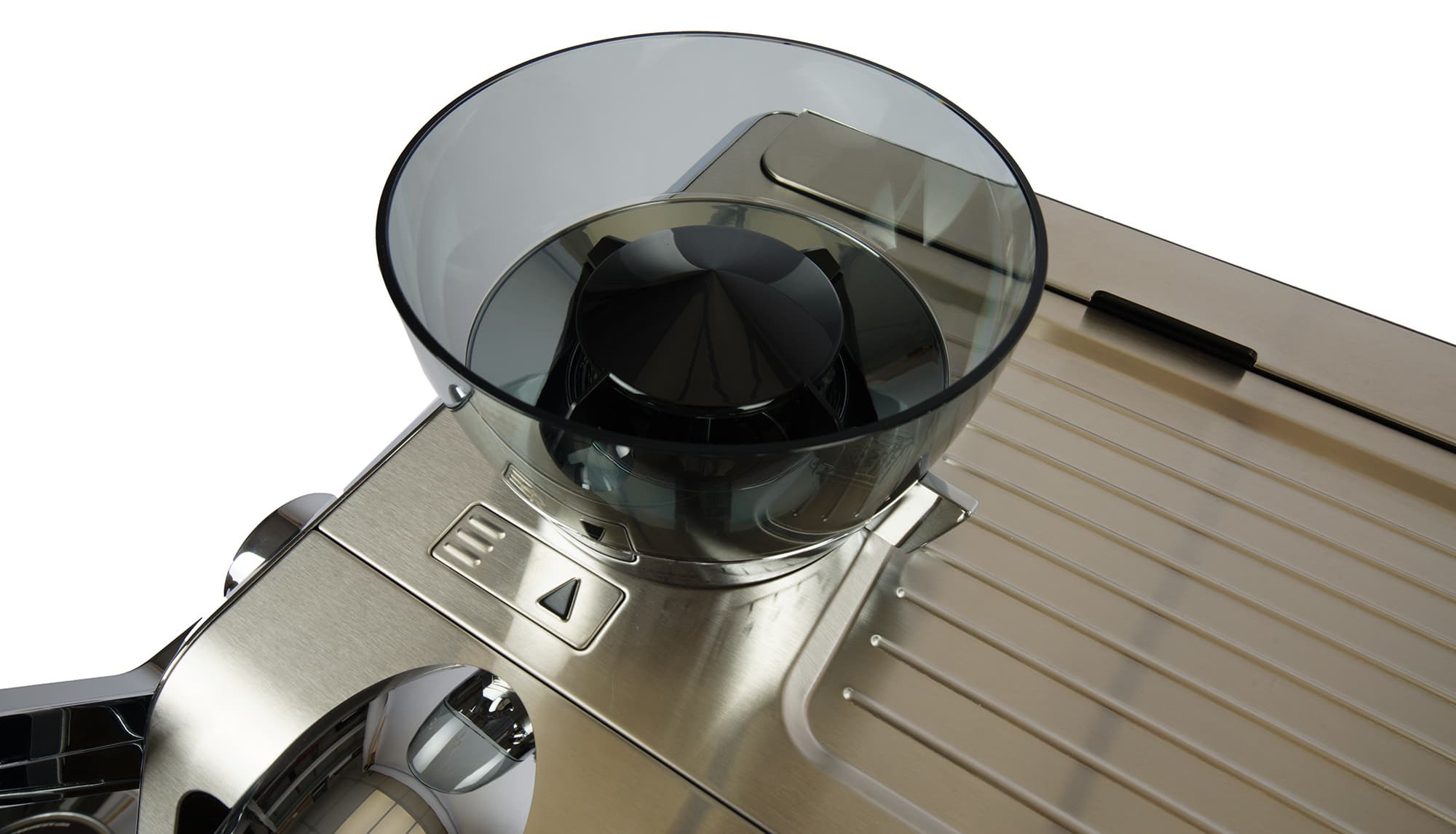 Бункер кофемолки устанавливается сверху, в левой части прибора. Рядом с бункером — лючок для очистки, на случай если молотый кофе застрянет и перестанет высыпаться. Справа от бункера — площадка для хранения и подогрева чашек.