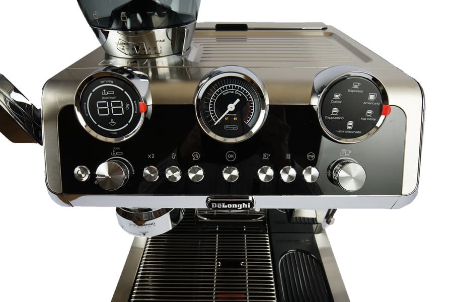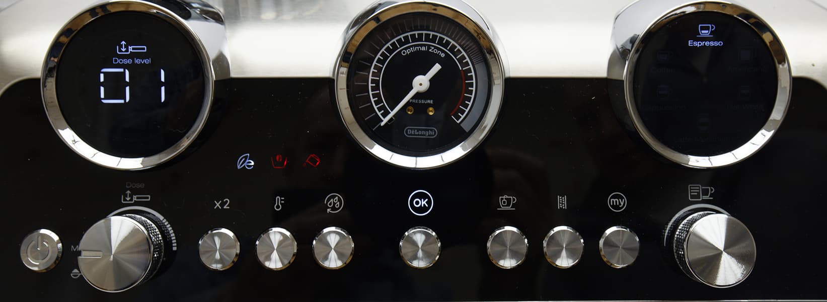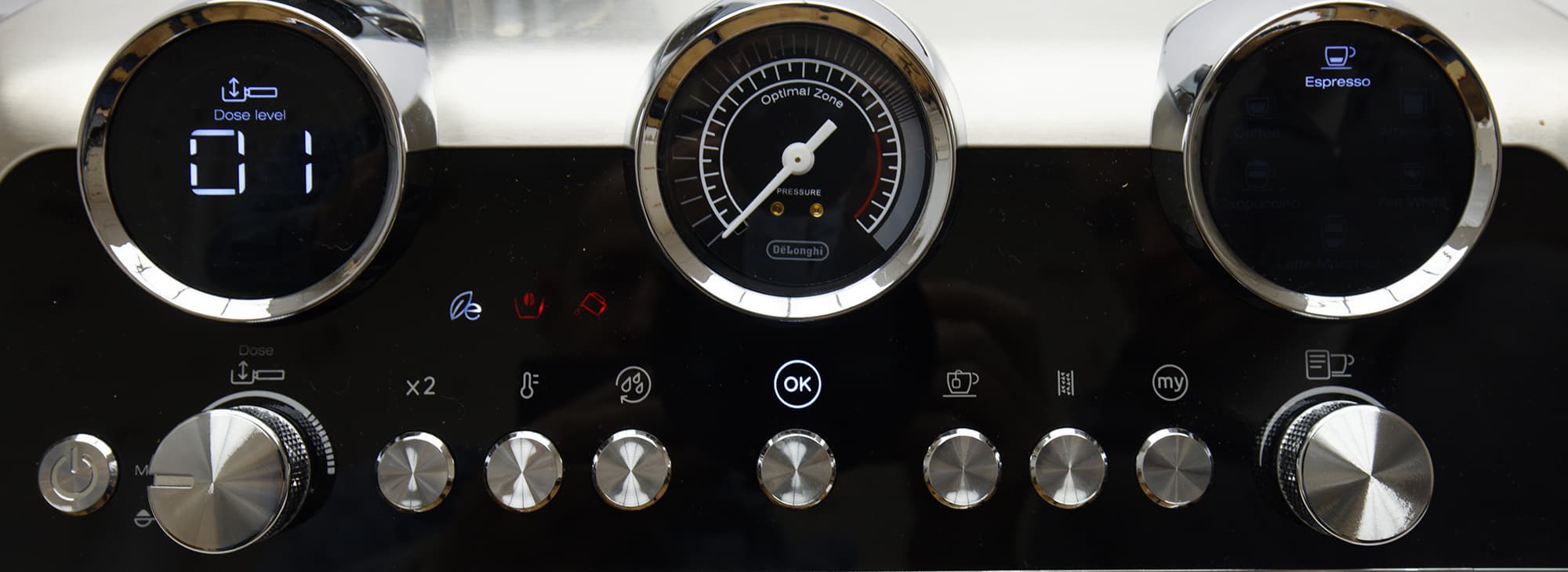 Как и у младшей модели, тут имеется механический манометр (без указания точных значений давления на шкале). Принципиально новые элементы — два круглых светодиодных дисплея, один из которых отвечает за регулировку помола, а второй — за приготовление различных напитков.