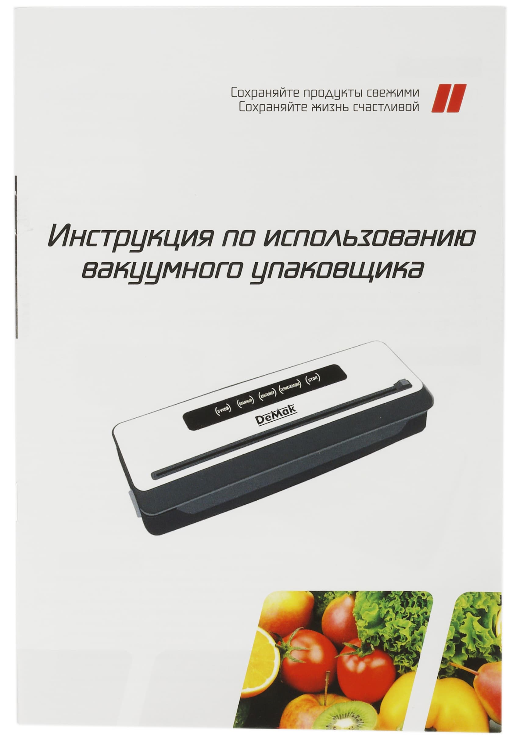 Руководство по эксплуатации вакууматора представлено в виде тоненькой брошюры формата А5 напечатанной на плотной глянцевой бумаге. Документ содержит массу цветных фотографий на тему правильного использования прибора, подробное описание принципов его работы и управления.