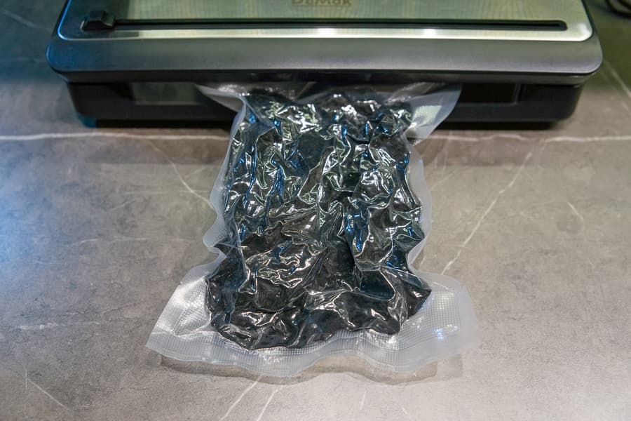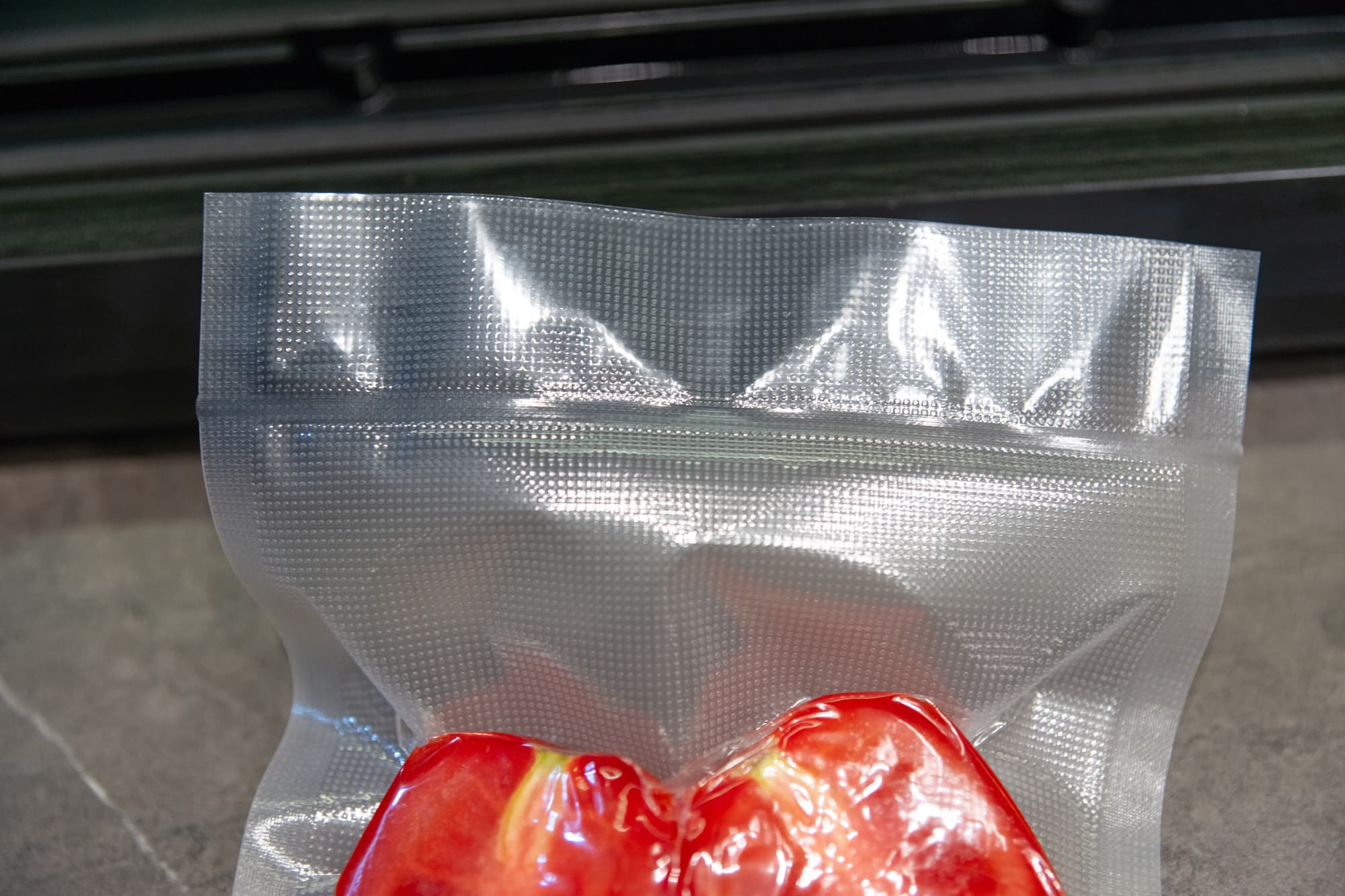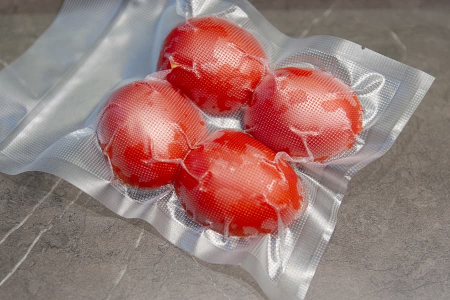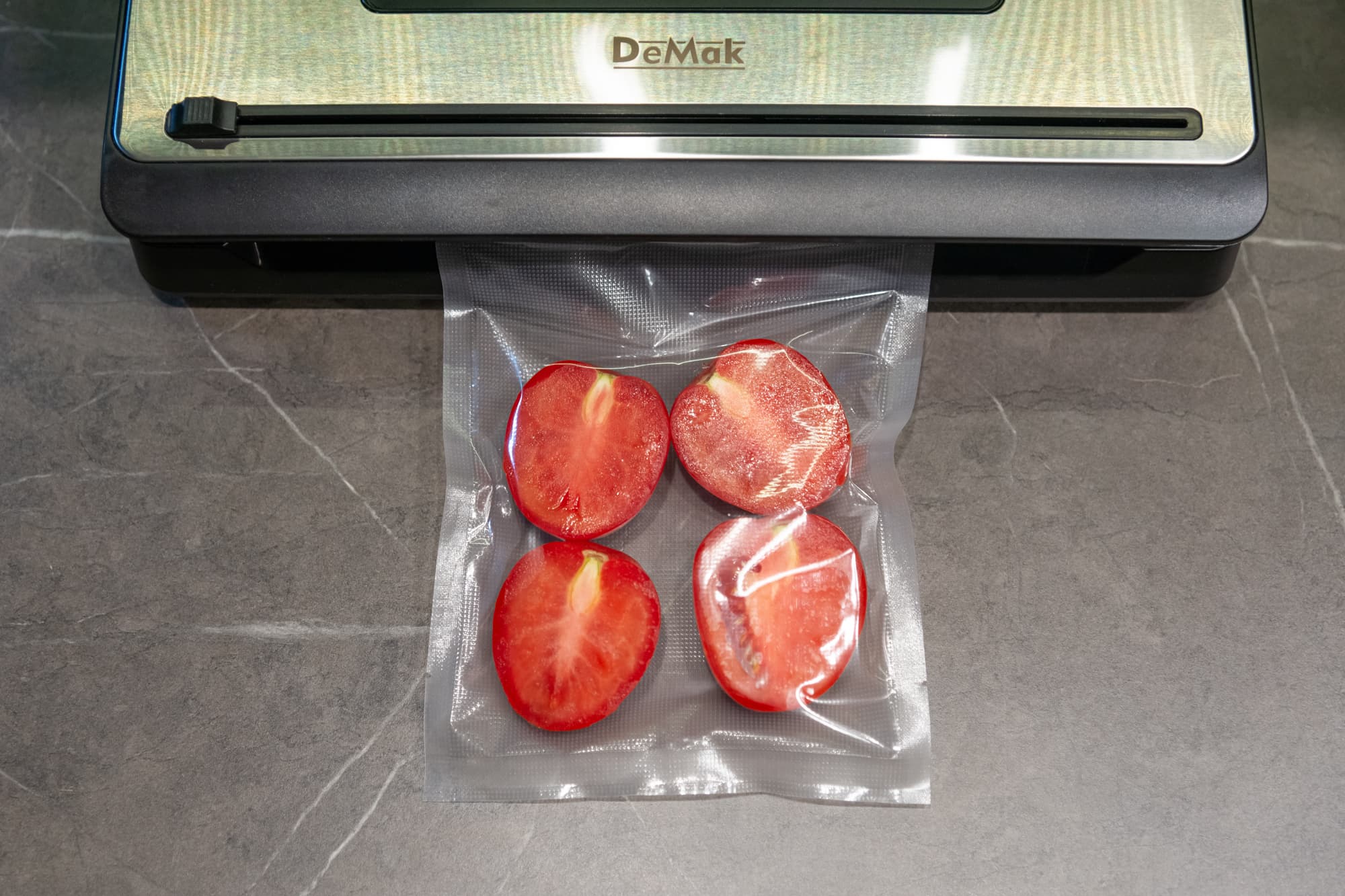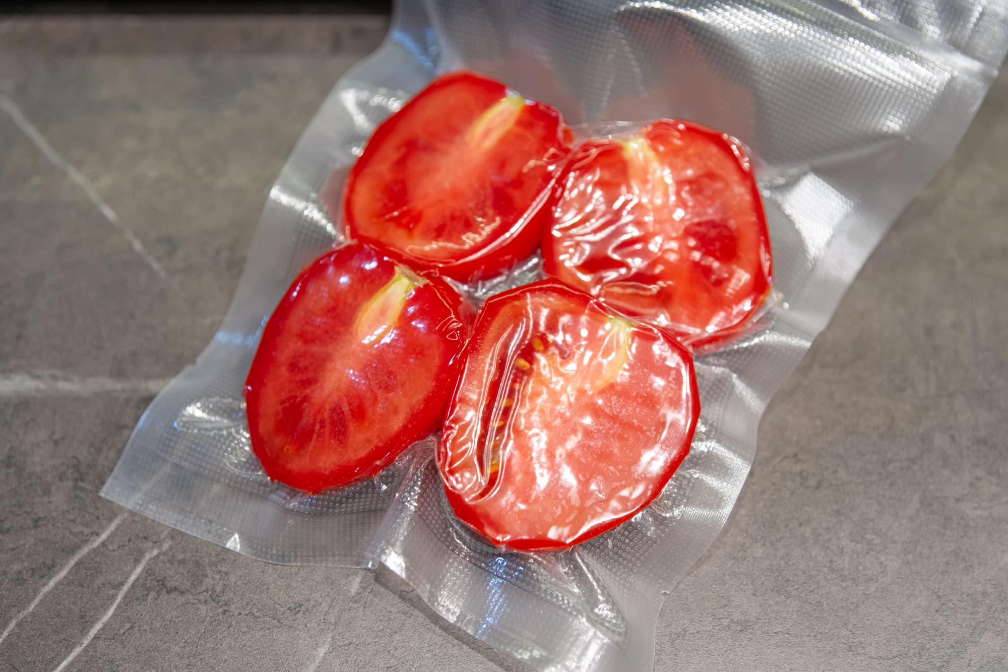 При вакуумации сочных продуктов мы бы не рекомендовали отвлекаться от процесса, тут важно проследить, не начнет ли жидкость подниматься вверх и не просочится ли в камеру. Если начнет, то нужно будет самостоятельно остановить процесс и сразу запаять пакет. У наших помидоров жидкость вверх не пошла, поэтому мы просто наблюдали — примерно секунд 15 на всё, и пакет готов.