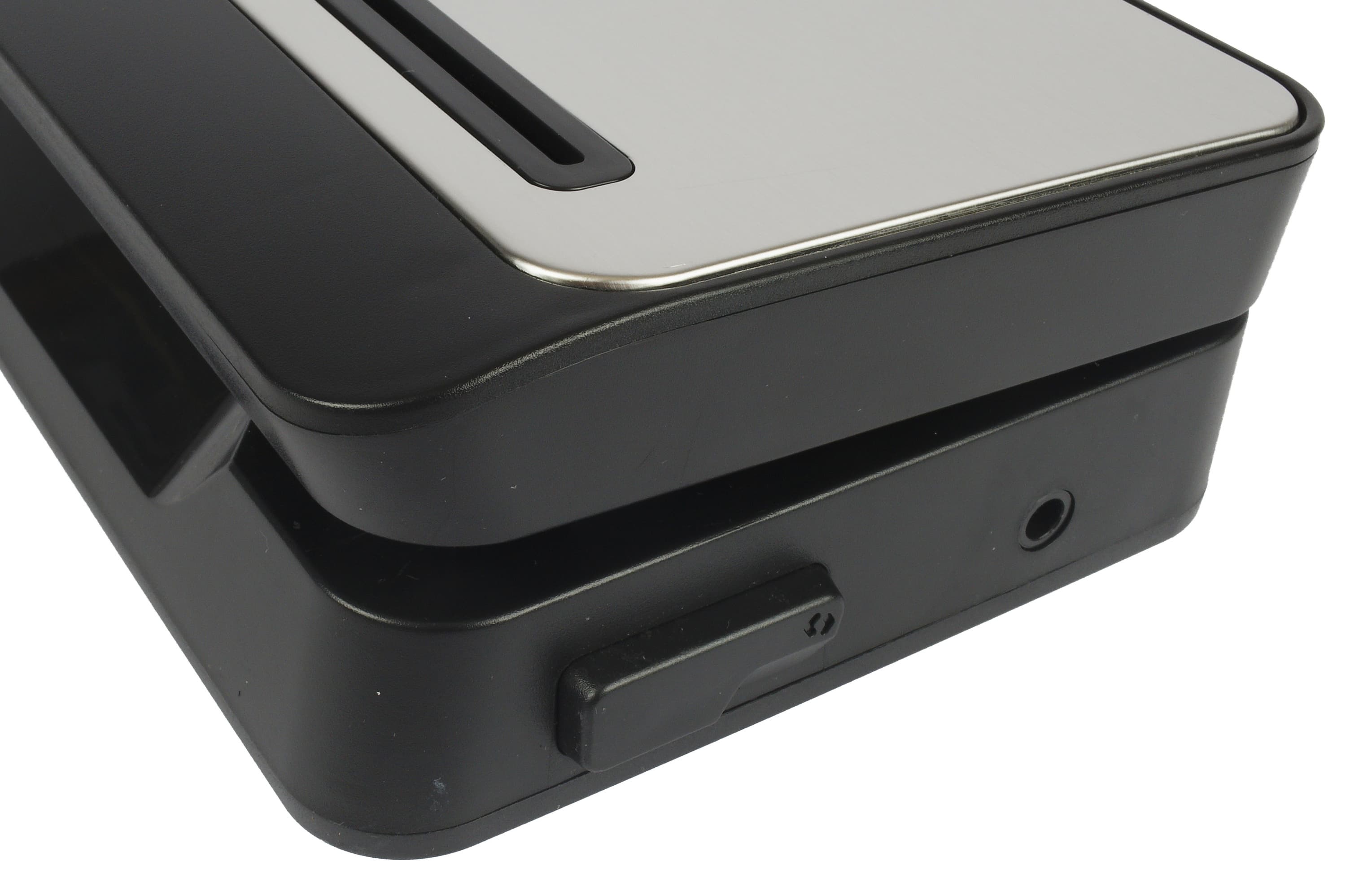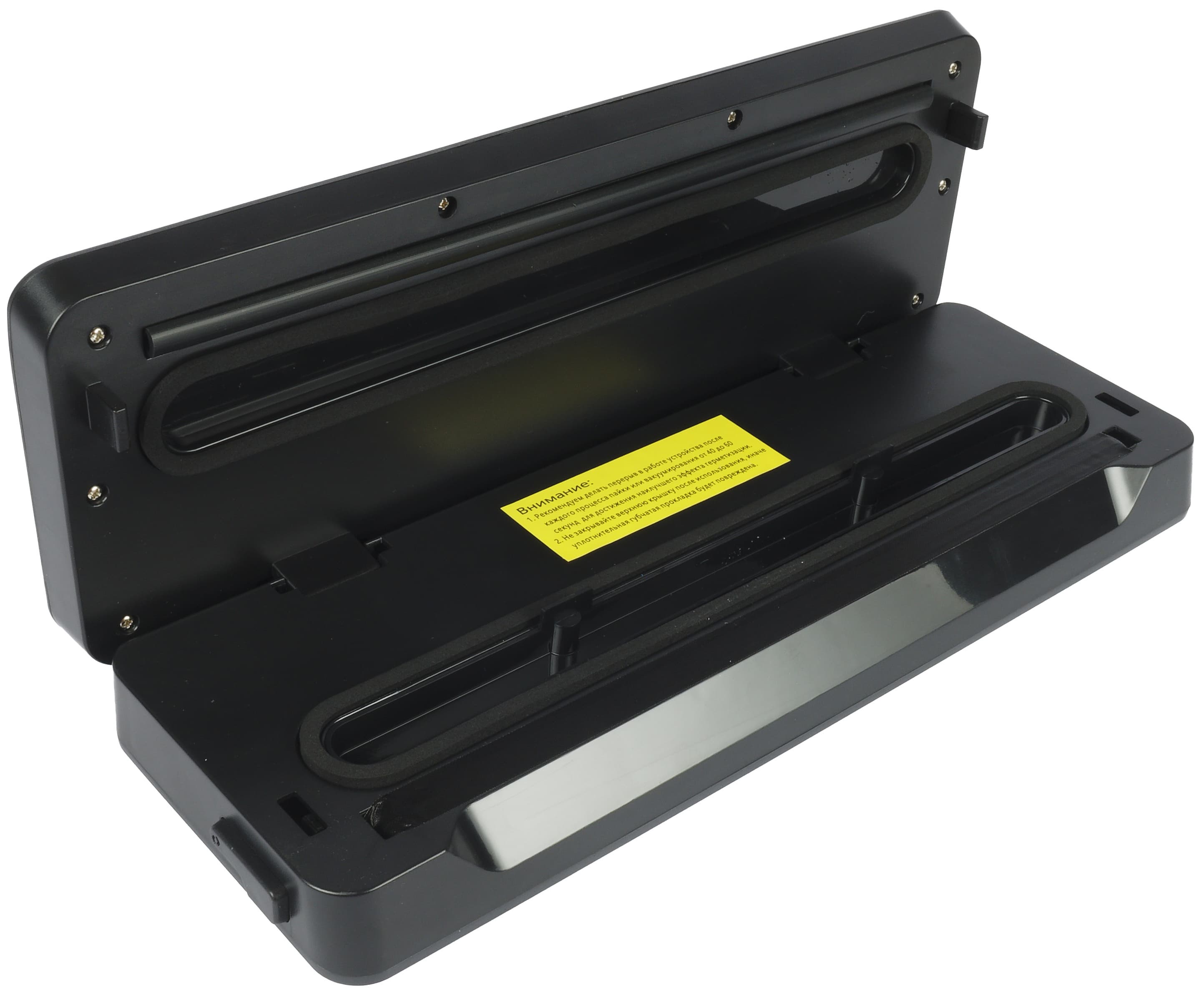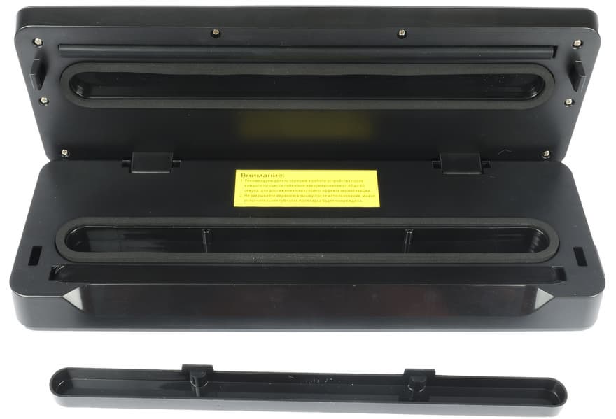 Корпус вакууматора в основном выполнен из черного матового пластика. В середине скошенной для удобства открывания крышки нижней части покрытие глянцевое.