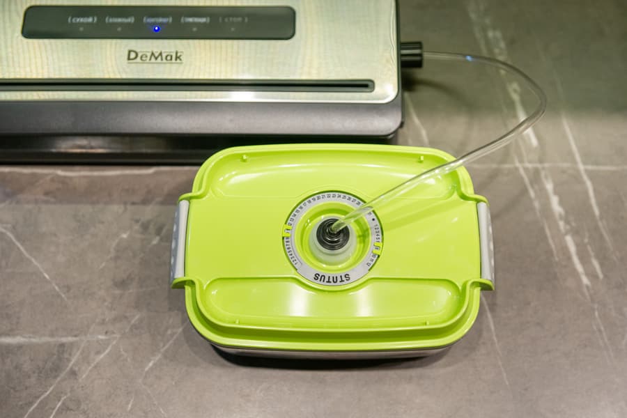 Затем защелкиваем крышку вакууматора и нажимаем кнопку Контейнер. Откачка воздуха в этом режиме занимает в среднем 15 секунд.