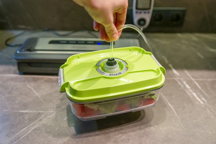Крышка умеренно туго закрывается нажатием на нее по углам до щелчков. Чтобы открыть крышку, нужно нажать на две крупные кнопки по бокам прибора. Рядом с правой кнопкой находится гнездо для подключения шланга для откачки воздуха из контейнера.