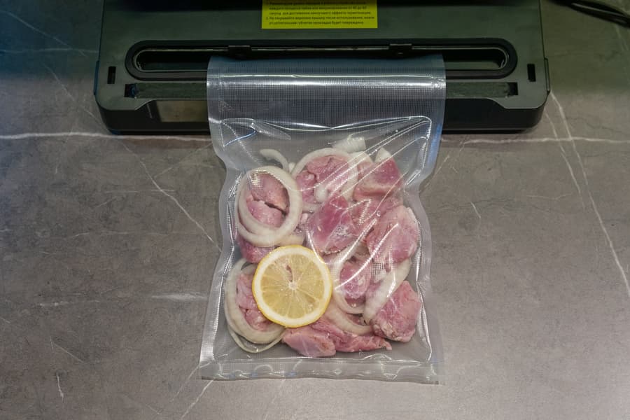 Будущий свиной шашлык предварительно полежал в маринаде примерно 6 часов. Чтобы не испачкать края пакетов, мы вывернули их наружу, затем поместили в пакет мясо, равномерно распределили в нем лук и добавили кружок лимона — всё, в чем мясо мариновалось.