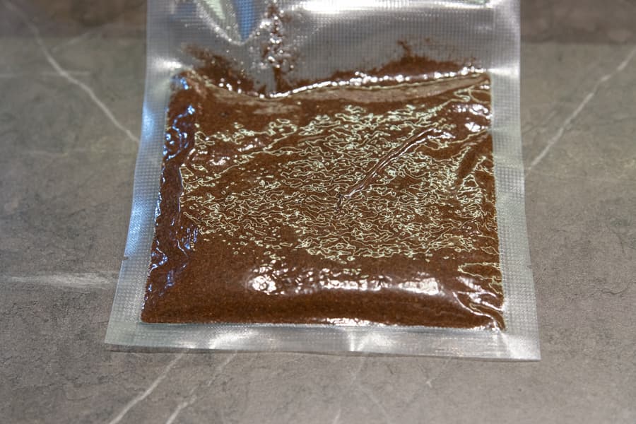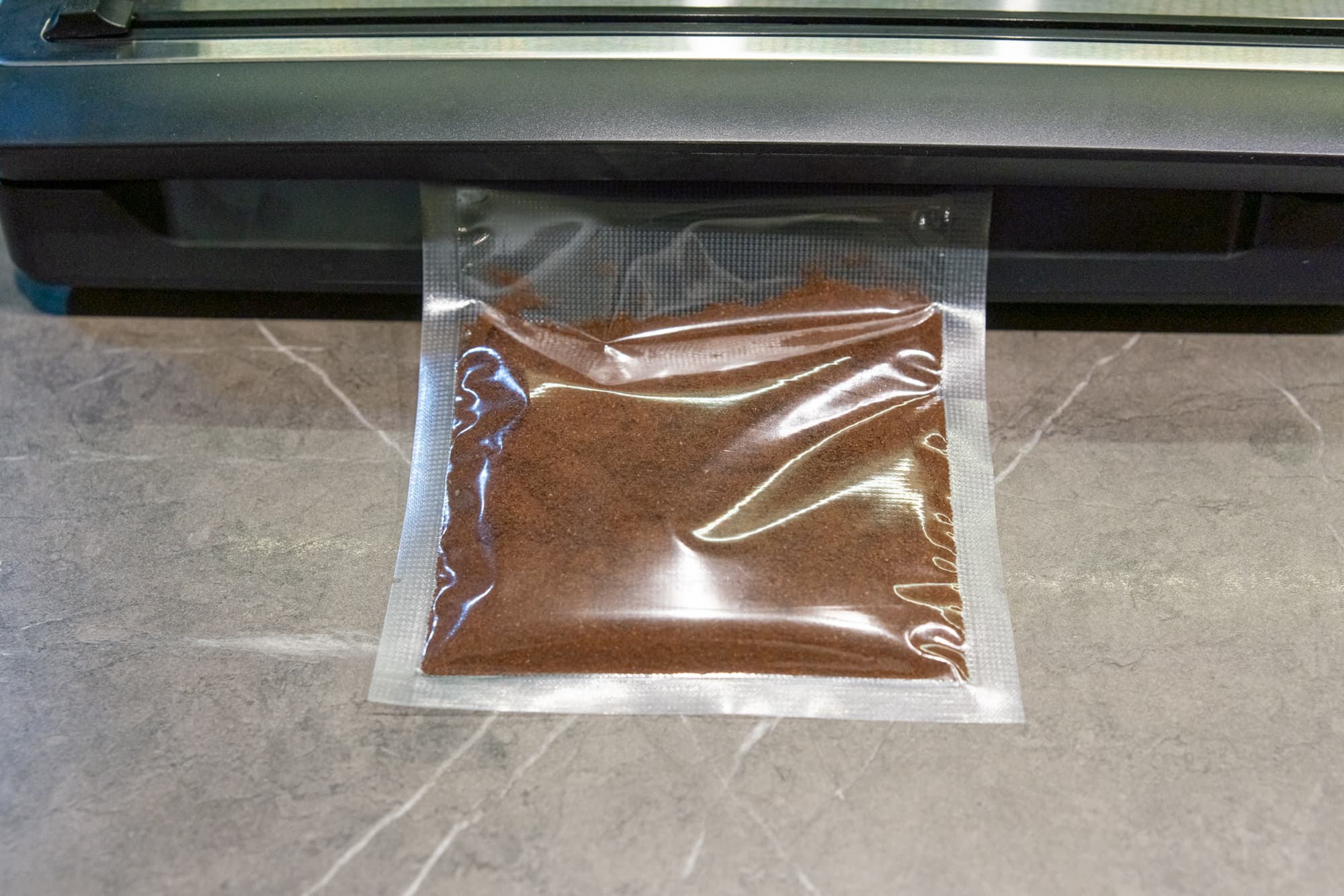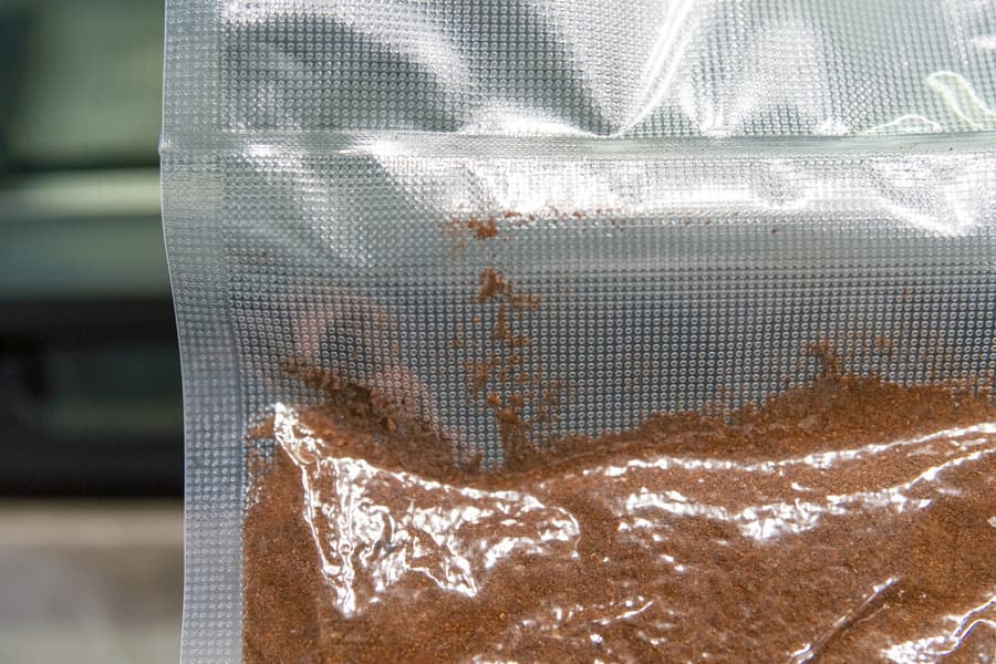 Кофе мелкого помола всыпали в пакет, перед размещением в камере разровняли содержимое, защелкнули крышку и запустили режим для сухих продуктов.