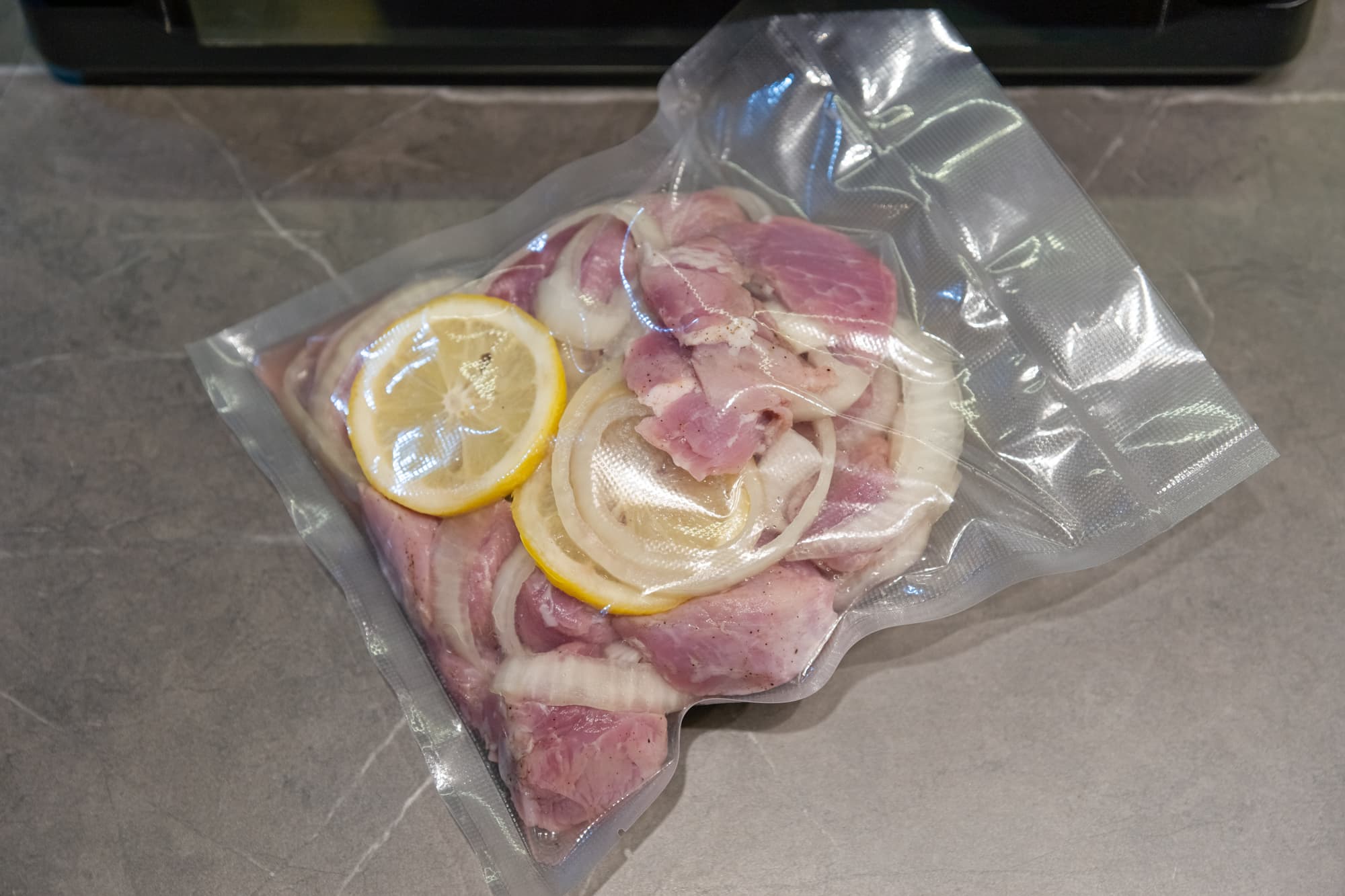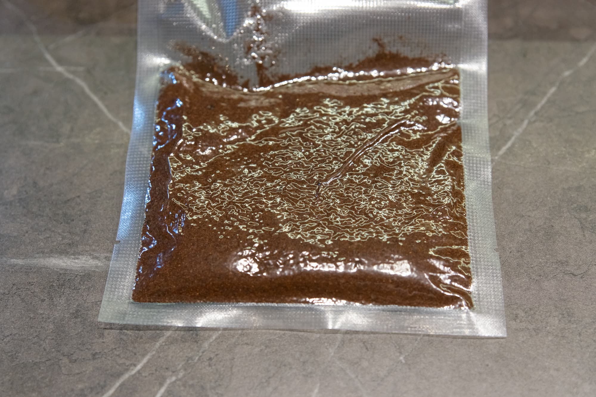 Пришлось достать контейнер, вылить жидкость, промыть, поставить на место и протереть салфеткой верх пакета. Маринада в пакете, естественно, стало меньше, поэтому мы добавили еще пару ложек. На второй раз всё прошло гладко. Воздух частично откачался, сок дойти до самого верха не успел, мы вовремя остановили насос и запаяли пакет.