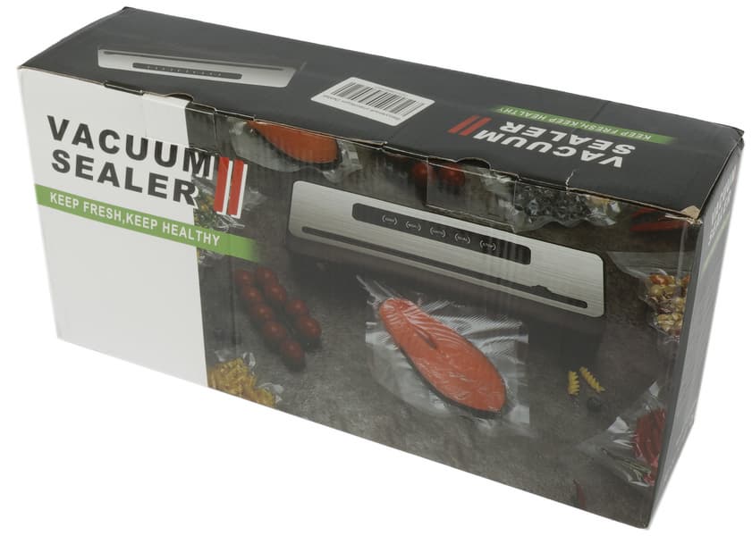 Вакууматор приехал к нам в глянцевой прямоугольной коробке. Большую часть лицевой стороны занимает яркое фото прибора и продуктов, упакованных с его помощью, рядом размещено название на английском. На боковых гранях есть более подробная информация с перечислением технических характеристик устройства.
