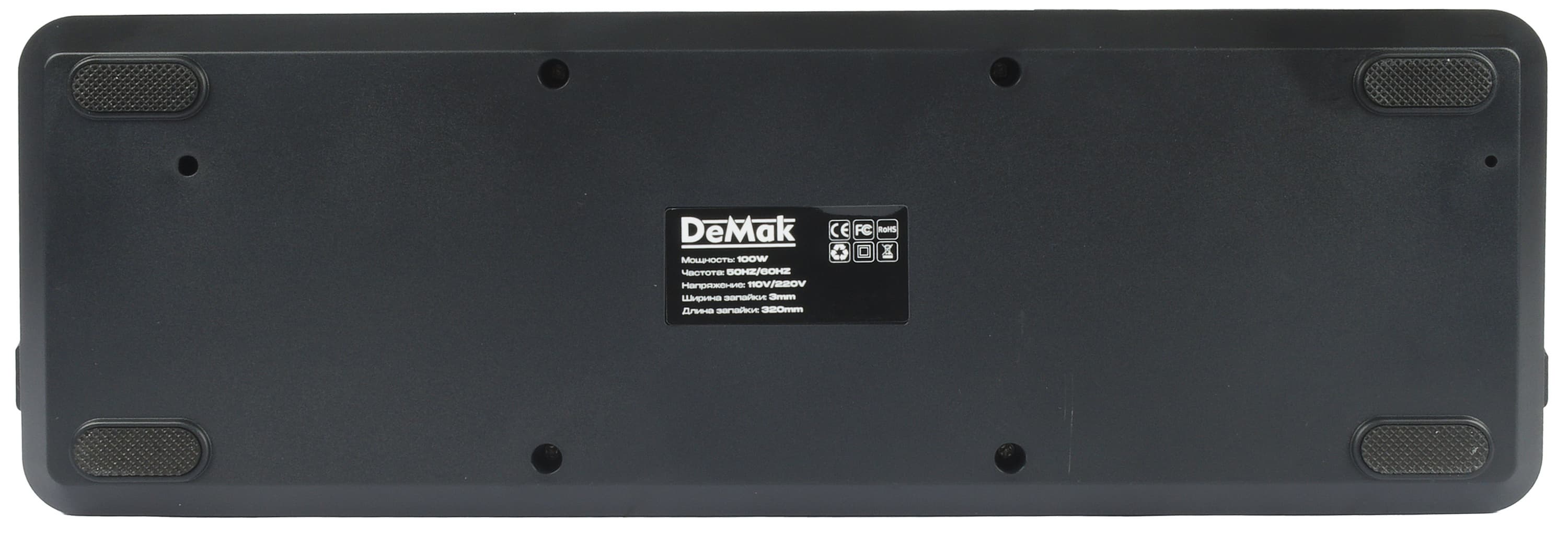 На дне прибора посередине наклеен шильдик с технической информацией, а по углам расположены ножки с противоскользящими накладками.