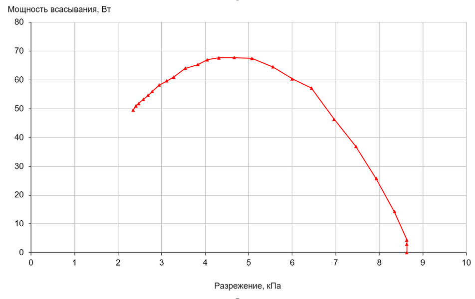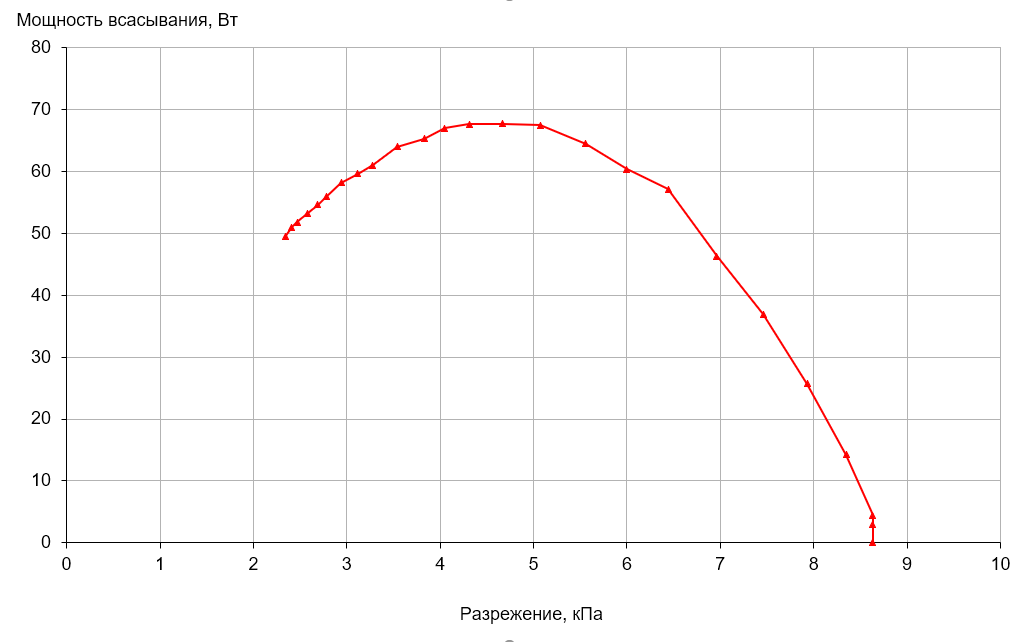 Мощность всасывания (что это такое и как мы ее измеряем, описано в отдельной статье) мы определяли при работе пылесоса без трубы и насадок, в обоих режимах. Зависимость мощности всасывания от создаваемого разрежения приведена на графике ниже: