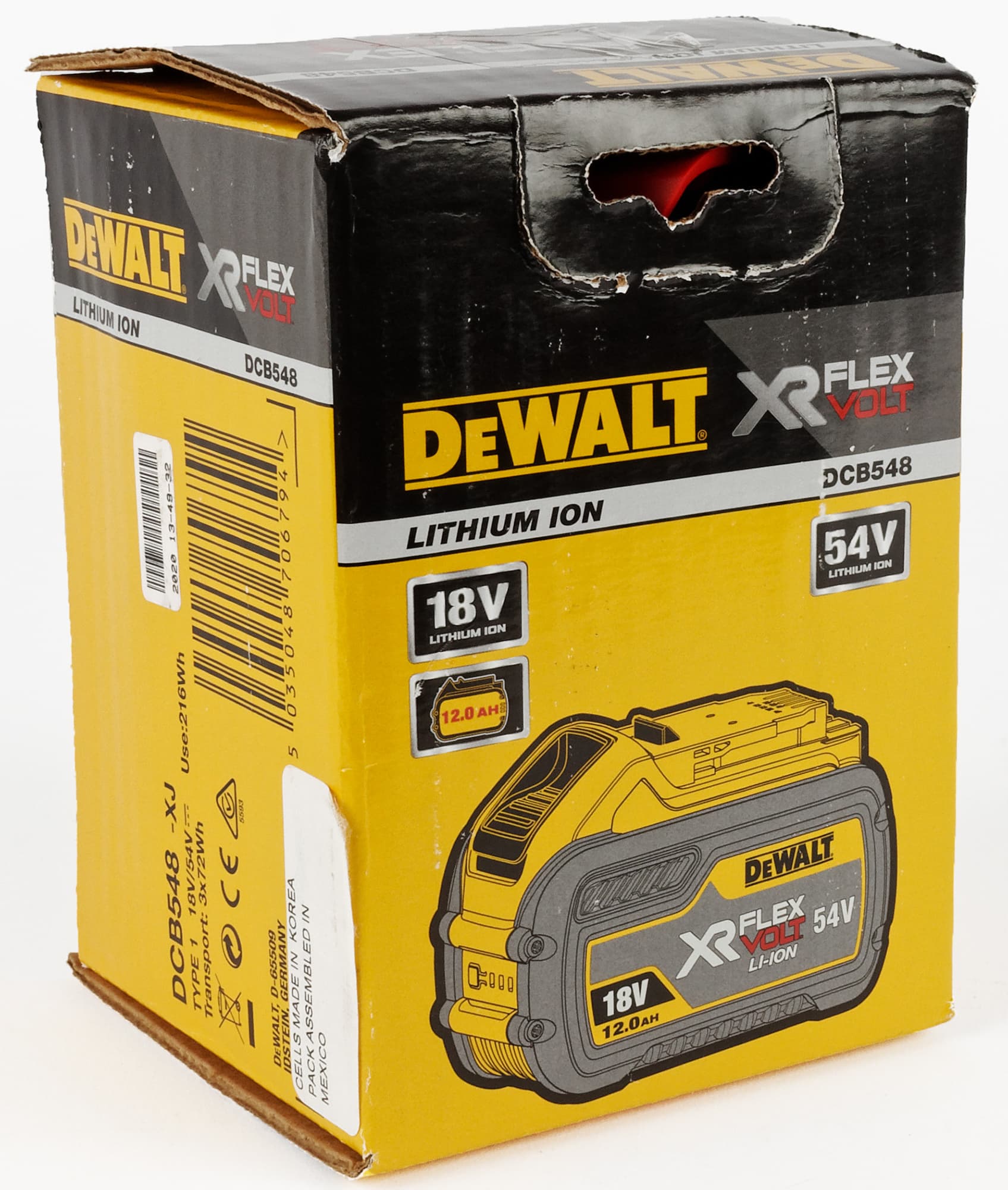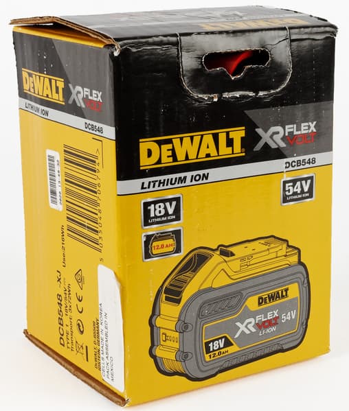 Картонная коробка источника питания выполнена в фирменном стиле компании. Из информации на ней мы узнаём, что аккумулятор является совместимым с двумя стандартами инструментов этого производителя: DeWalt XR 18V и интересующего нас в первую очередь DeWalt FlexVolt 54V. Собственно говоря, батарея представляет собой три 18-вольтовые сборки, которые могут подключаться параллельно или последовательно.