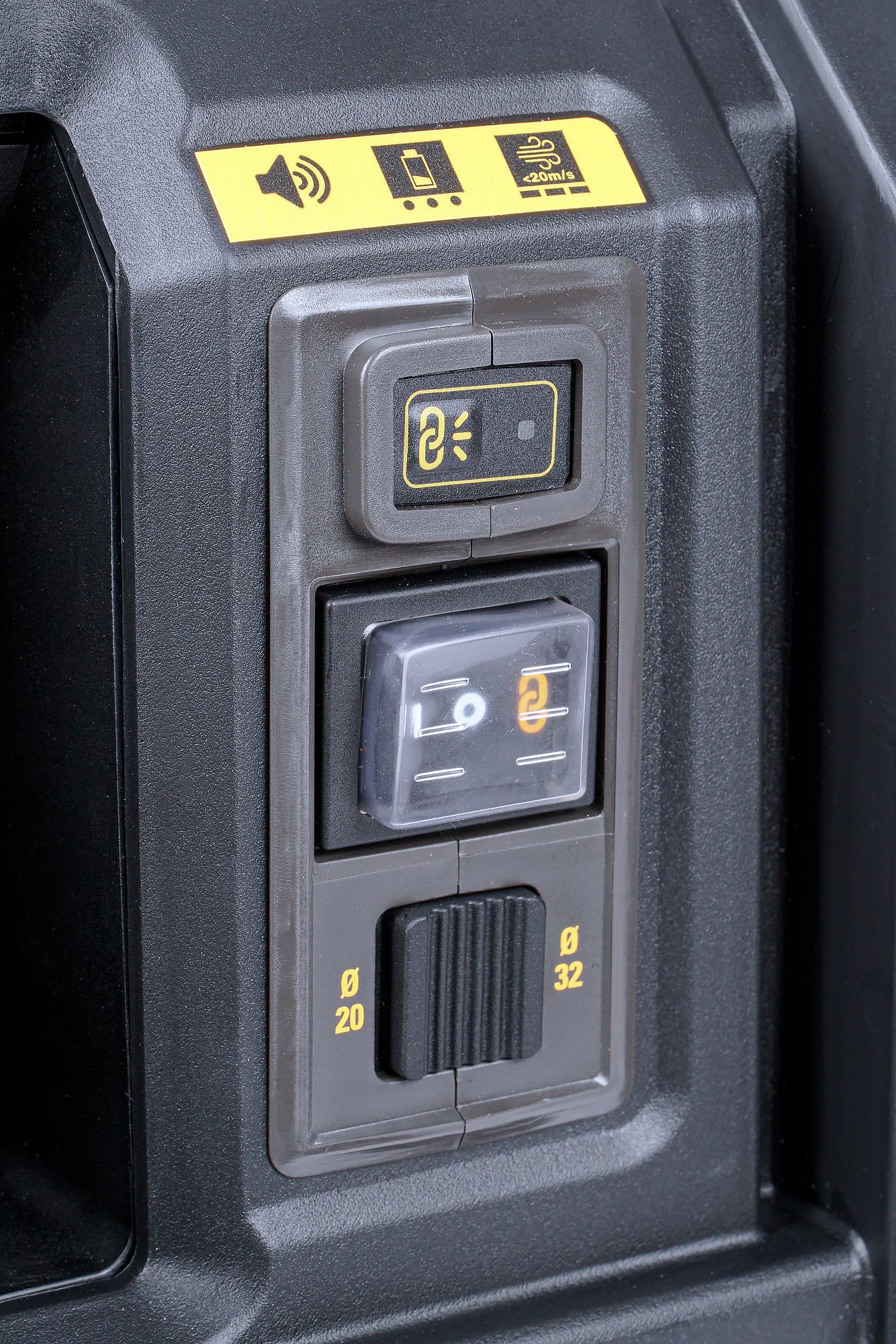 Под клавишей включения располагается двухпозиционный переключатель скорости потока воздуха. С его помощью настраивается чувствительность системы контроля воздушного потока, срабатывающей при засорах. При использовании шлангов и насадок диаметром 32 мм переключатель следует перевести в правое положение, а при подключении через соответствующий переходник насадок и приспособлений с «бытовым» диаметром 20 мм — в левое.