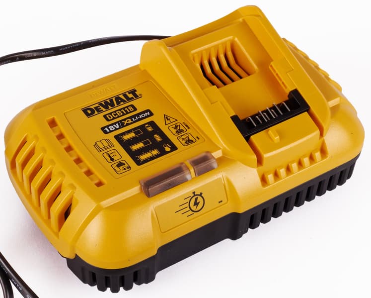 Отдельно от пылесоса поставляется и зарядное устройство. Для зарядки аккумулятора прибора мы воспользовались сетевым зарядным устройством DeWalt DCB118.