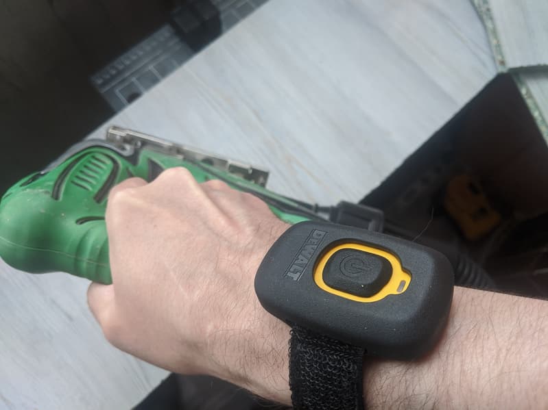В режиме беспроводного управления DeWalt DCV586MN может включаться и выключаться вручную, нажатием на кнопку наручного пульта. Работать с ним оказалось очень удобно: пылесос четко реагирует на команды, а к объемному, но легкому «браслету» на запястье привыкать пришлось недолго: через непродолжительное время он стал ощущаться так же естественно, как наручные часы.