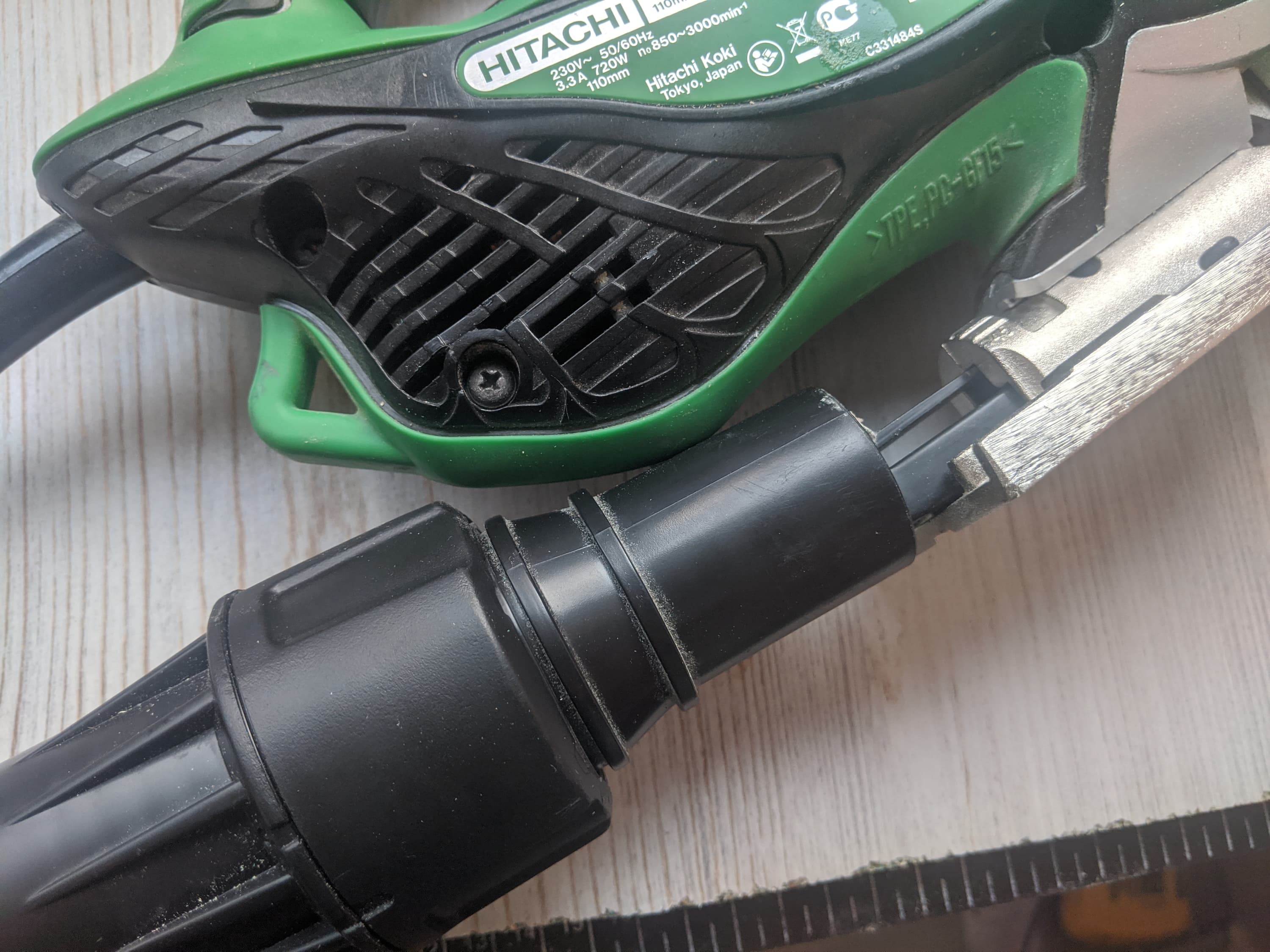 Это не вполне штатное подключение, имеющее определенные недостатки: широкая труба пылесоса, как можно видеть на фото, оказывается чуть ниже уровня подошвы лобзика и слегка задевает за край обрабатываемой поверхности. Проблема устраняется кратковременным приподниманием инструмента при приближении к краю.
