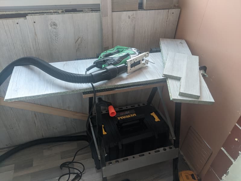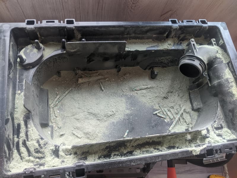 Значительная часть мелкой пыли засасывалась пылесосом сразу же, что не позволяло едкому облаку распространяться по всему помещению. Неизбежно образующиеся крупные опилки и обрезки были удалены по окончании работы с помощью того же пылесоса и напольной насадки из комплекта для уборки пола. Мощности устройства оказалось вполне достаточно для засасывания крупных обрезков древесно-стружечной плиты даже при использовании «бытовой» 24-миллиметровой насадки.