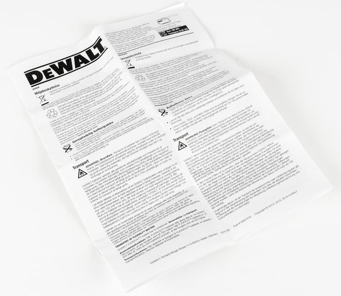 Коробка не перегружена информацией: на всех ее сторонах красуется схематическое изображение устройства, логотип аккумуляторной системы FlexVolt и вольтаж системы (54 В). На лицевой и обратной стороне размещены также иконки, иллюстрирующие основные особенности прибора. Все они понятны без перевода — за исключением изображения перечеркнутого гаечного ключа: мы так и не поняли, имеется ли в виду возможность подключения шланга без дополнительных инструментов, невозможность разборки устройства или еще что-то.