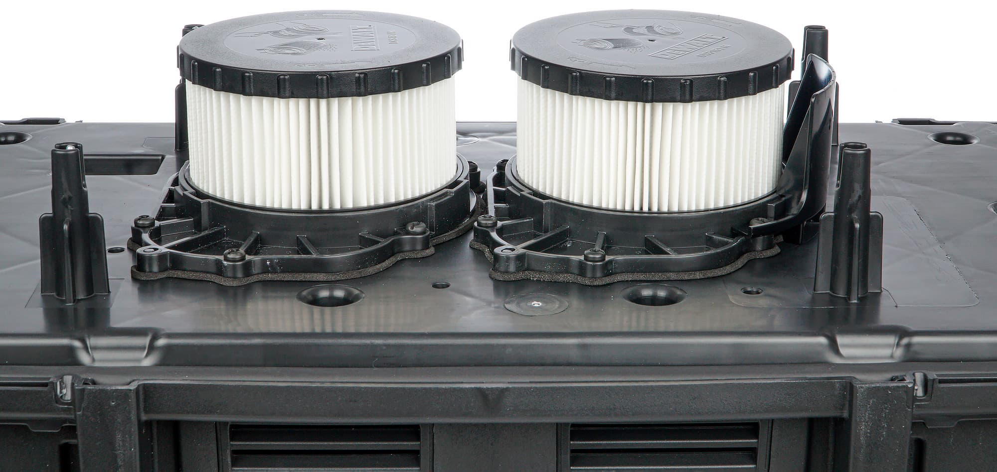 На дне моторного блока размещаются два одинаковых цилиндрических фильтра. Автоматическая система самоочистки, используемая в DeWalt DCV586MN, подразумевает попеременное их функционирование. В то время, пока один фильтр работает традиционным образом, на другой изнутри подается обратный поток воздуха: он выдувает пыль, скопившуюся в складках элементов тонкой фильтрации. Постоянно меняясь ролями, обе части системы остаются чистыми.