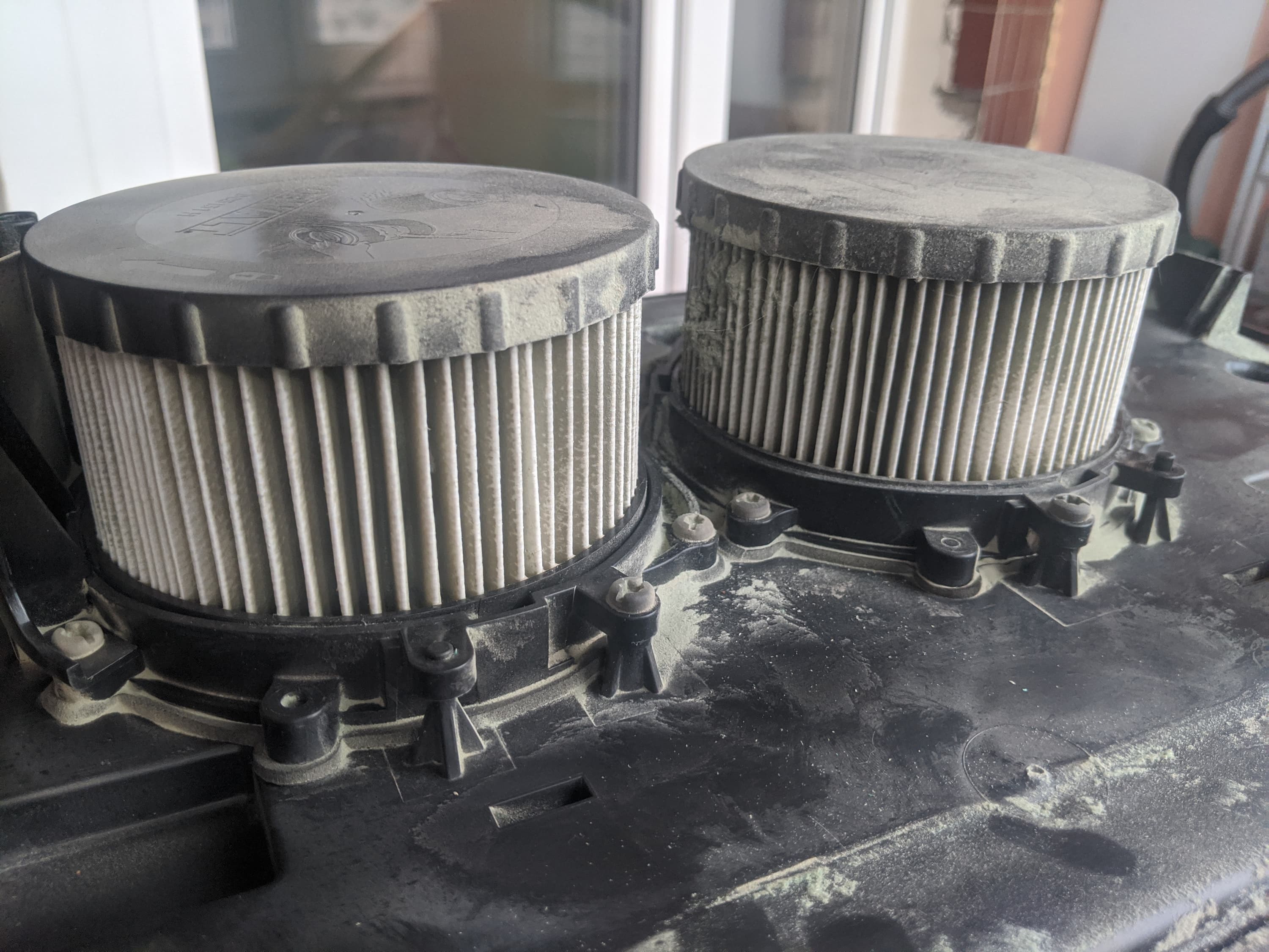 На фото можно видеть результат работы автоочистки: «отдыхающий» левый фильтр чист, на правом же, закончившем работу в режиме всасывания, осталось заметное количество пыли.