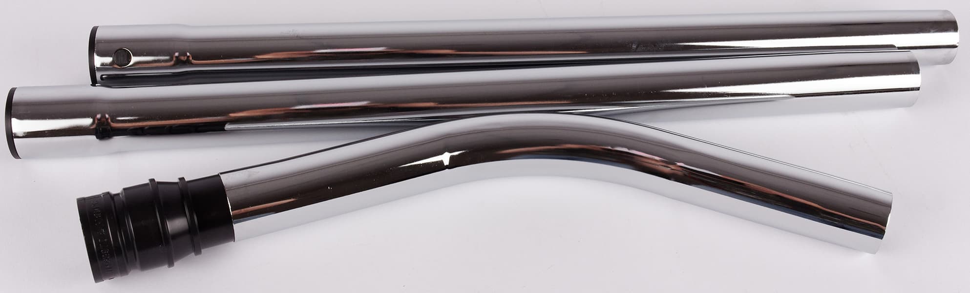 Никелированные удлинительные трубки снабжены переходником с «промышленного» диаметра 34 мм на «бытовой» 24 мм. Если вставить его в шланг пылесоса, то можно использовать любую трубку или насадку из комплекта в произвольной комбинации.