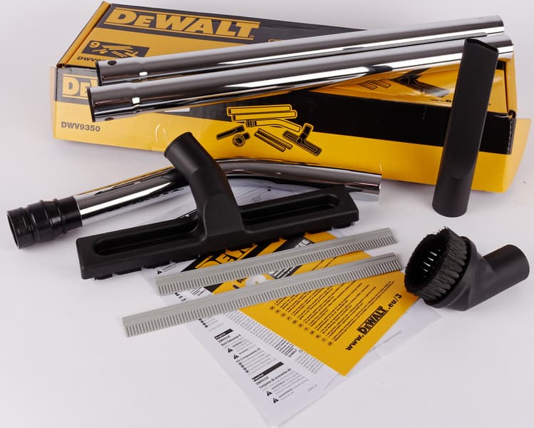 Даже промышленным пылесосом приходится иногда решать бытовые задачи, DeWalt DCV586MN — не исключение. Для него существует поставляемый отдельно набор для уборки пола DWV9350, который состоит из насадок и удлинительных трубок «бытового» диаметра 24 мм.