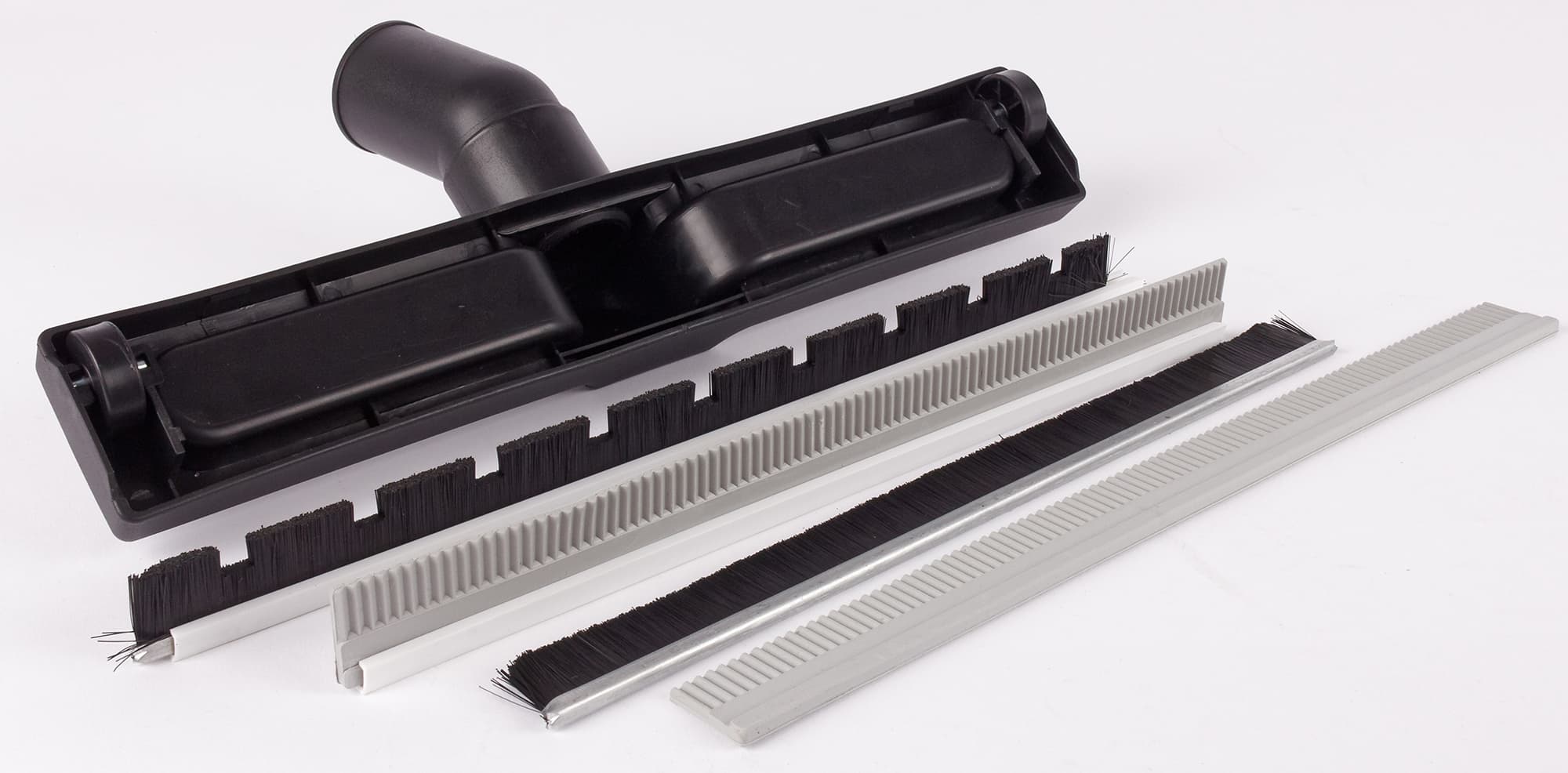 Насадка для уборки пола имеет два комплекта уплотнителей, вставляющихся в специальные пазы. Две щетки предназначены для сухой уборки, а силиконовые ламели — для сбора воды.