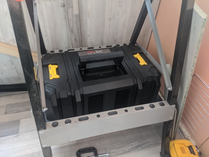 Пылесос идеально разместился между ножек складного верстака, на котором мы работали, и не путался под ногами.