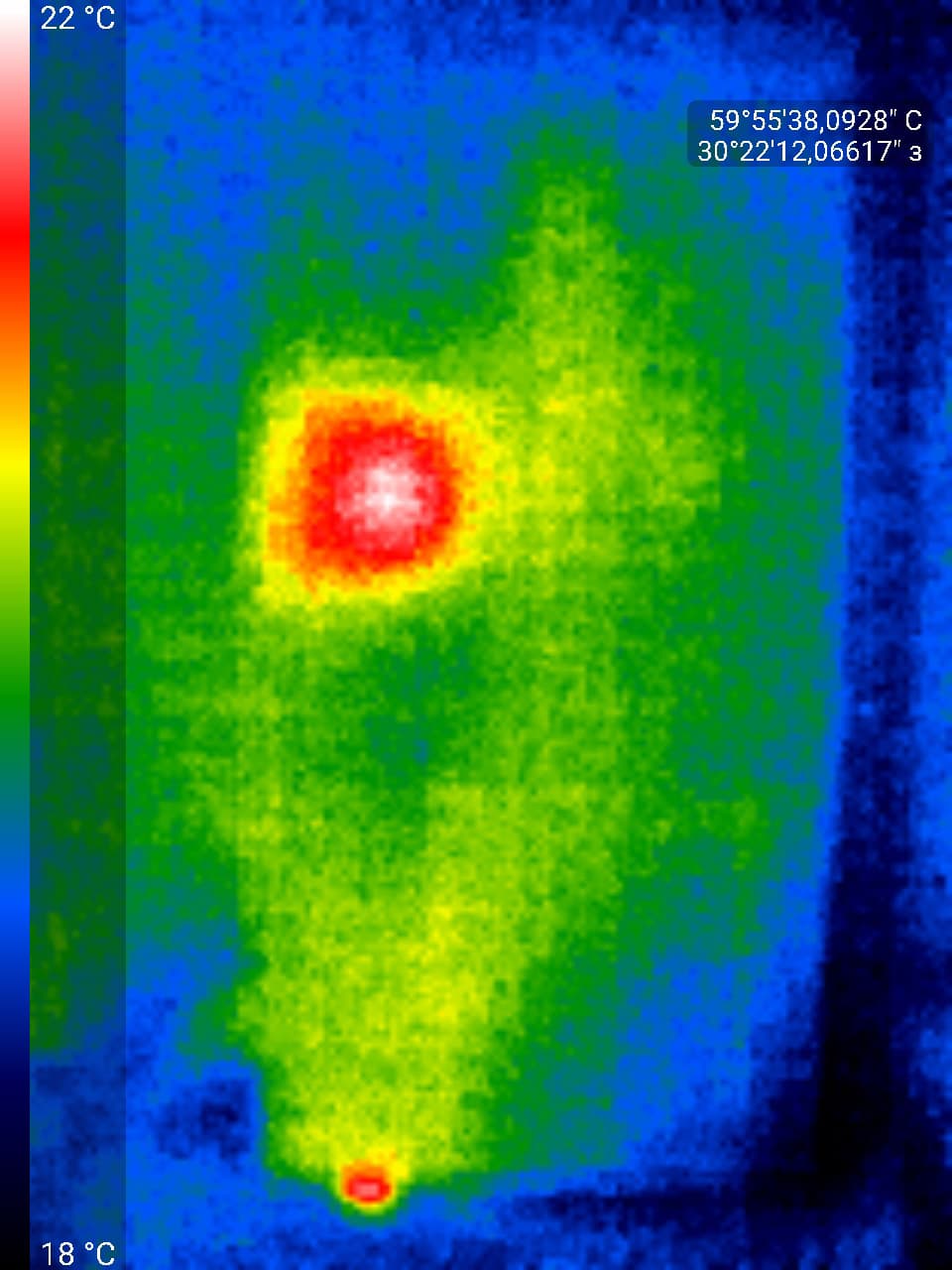 Как мы видим, на фото правая сторона холодильника выглядит гораздо более горячей, чем левая (судя по всему, через нее отводится лишнее тепло).