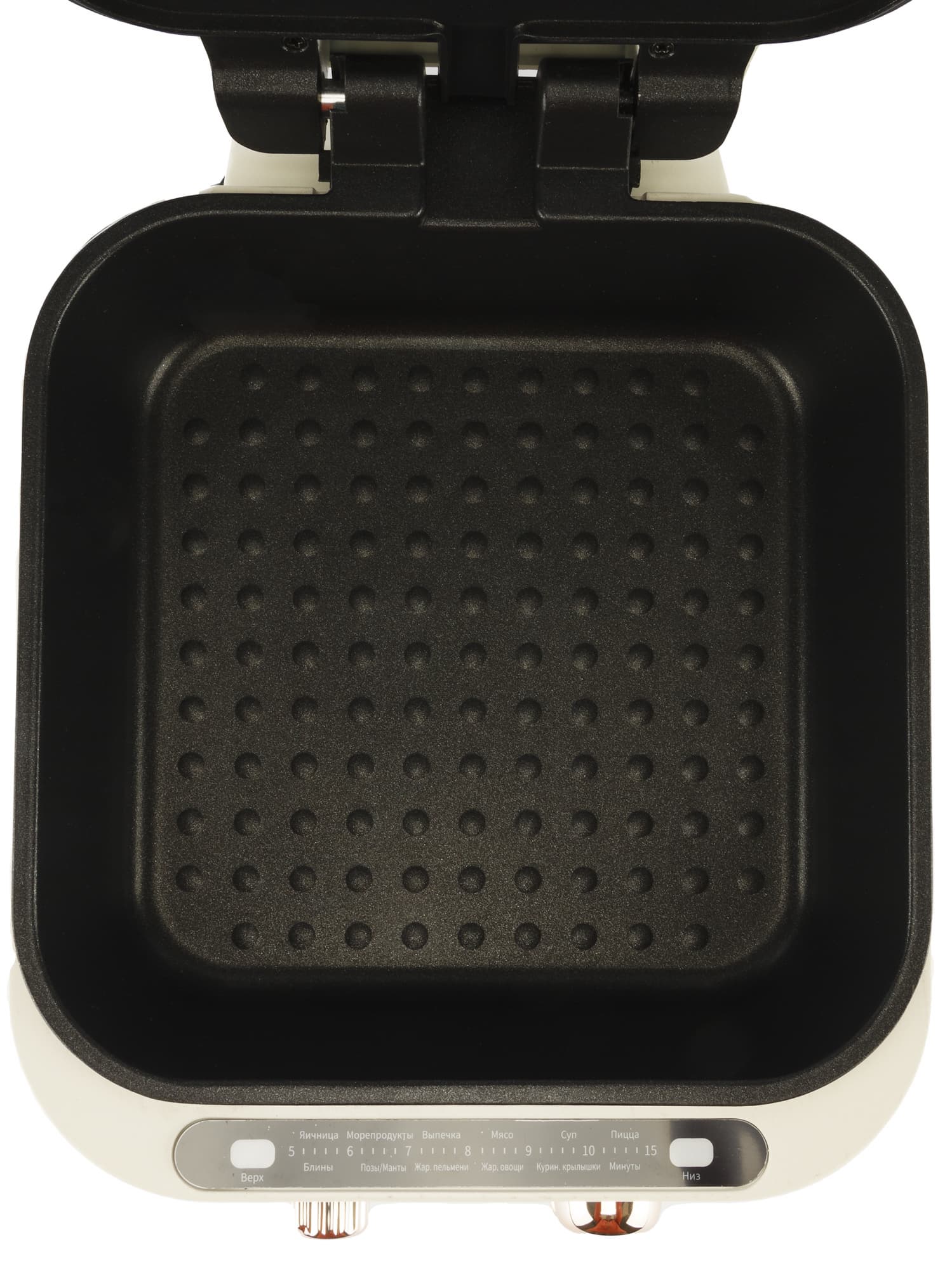 Под панелью гриля с антипригарным покрытием находится достаточно мощный тэн. По заявлениям производителя, максимальная мощность прибора составляет 1800 Вт.