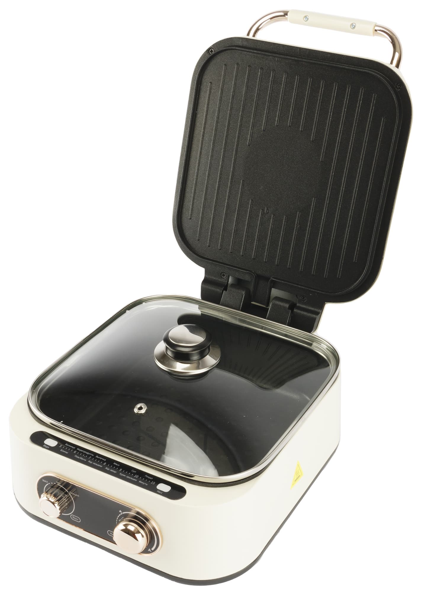 Внутри окрашенного в кремовый белый цвет округлого корпуса находится встроенная кастрюля с закругленными углами. На откидывающейся крышке изнутри мы видим несъемную панель гриля.