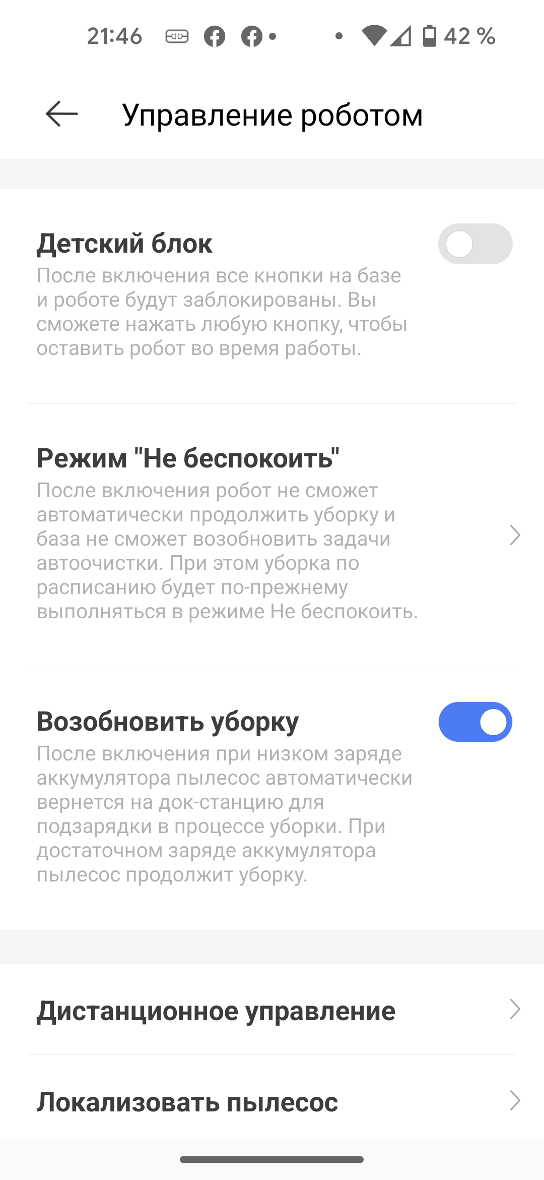 В разделе «Управление роботом» можно установить защиту от детей, заблокировав кнопки на корпусе (почему-то эта опция очень редко встречается на роботах-пылесосах), настроить режим «Не беспокоить», и заставить потерявшийся в квартире прибор подать голос.