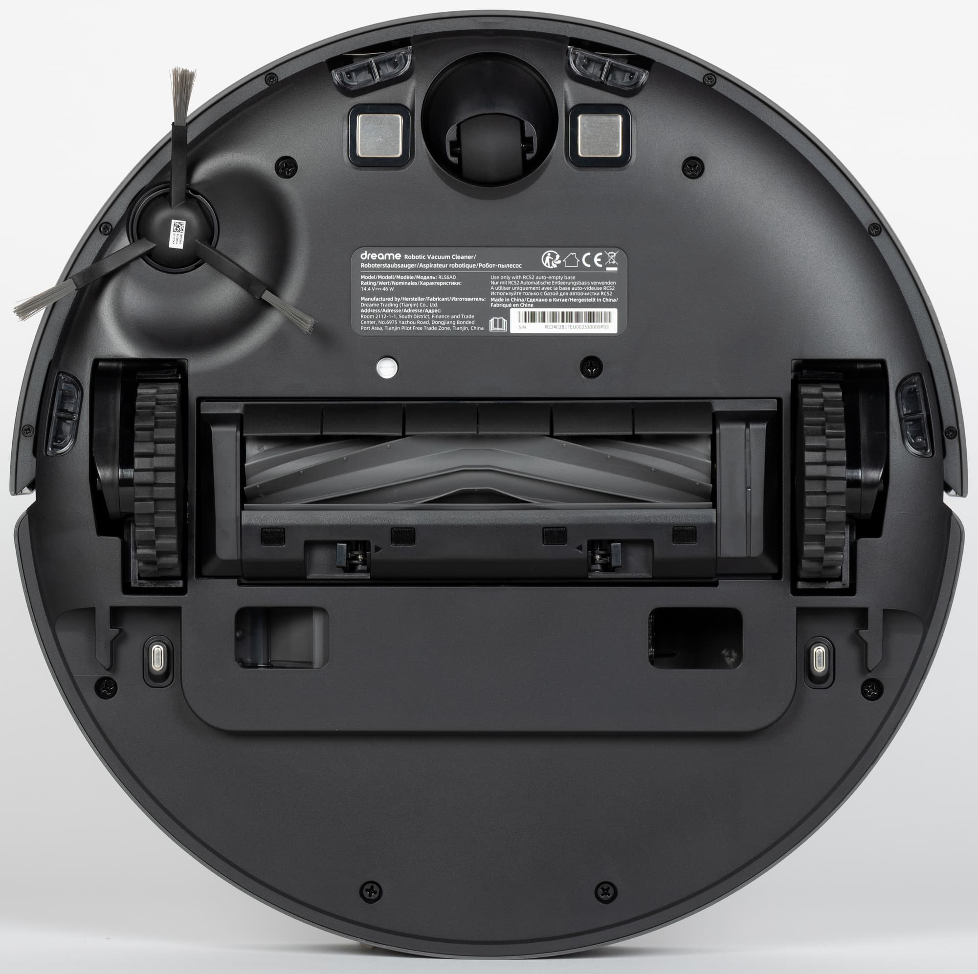 Рядом с колесами можно видеть инфракрасные датчики поверхности, защищающие устройство от падения с высоты (к примеру, с лестничных ступеней). Справа и слева от опорного колеса находятся два металлических контакта, используемых для зарядки на базе.