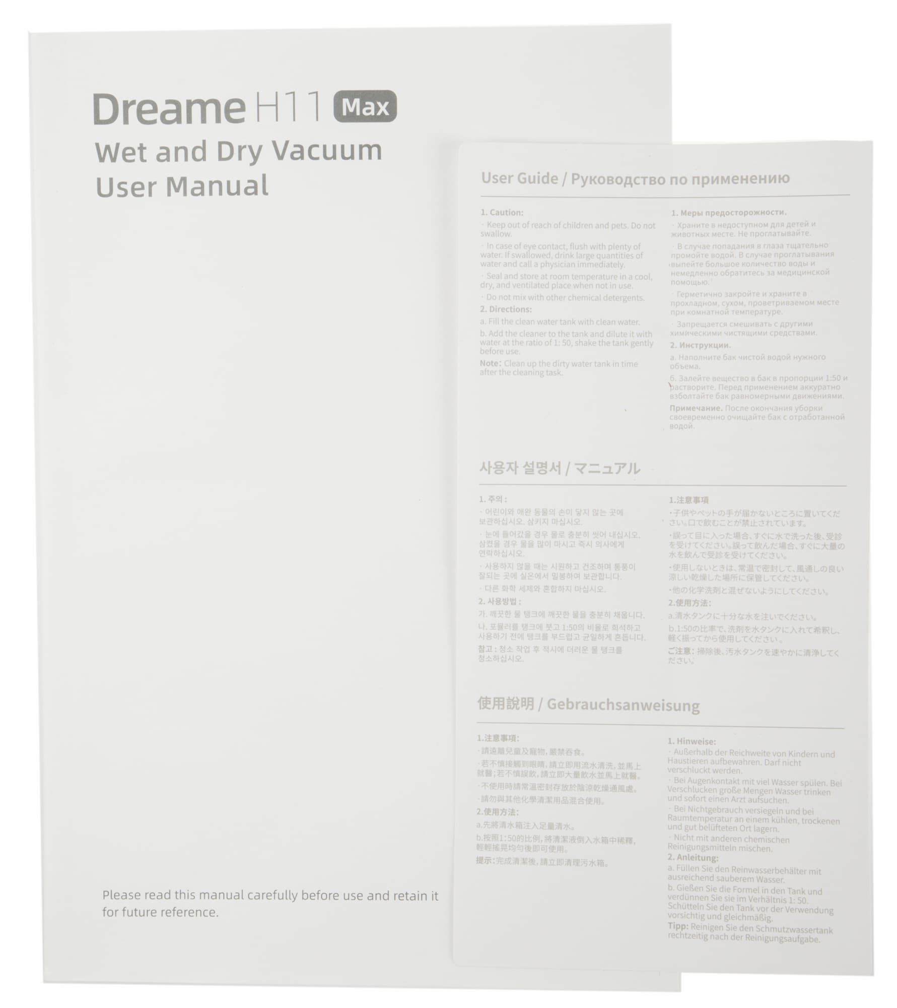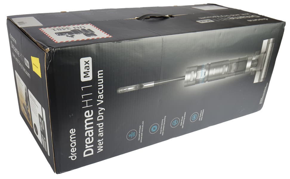 Прибор приехал к нам в объемной коробке из глянцевого картона с полноцветной печатью. Помимо логотипа производителя (весьма похожего по шрифтовому решению на фирменный знак известной европейской марки), названия модели и цветных фотографий прибора, на упаковке сообщается: H11 Max предназначен как для сухой, так и для влажной уборки, снабжен интеллектуальной системой определения уровня загрязненности, роторной щеткой с системой самоочистки, светодиодным дисплеем и голосовым помощником.