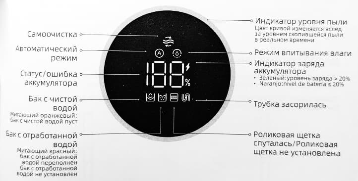 Уровень заряда аккумулятора показан в центре дисплея. Над цифрами статуса батареи находятся три индикатора режима. Справа есть значок критического уровня: он загорается, если заряд устройства снижается до 20% и менее. Ниже располагаются четыре значка, сигнализирующих о различных неисправностях: опустошении бака с чистой водой, переполнении резервуара с грязной, запутывании щетки или засорении воздушного тракта.