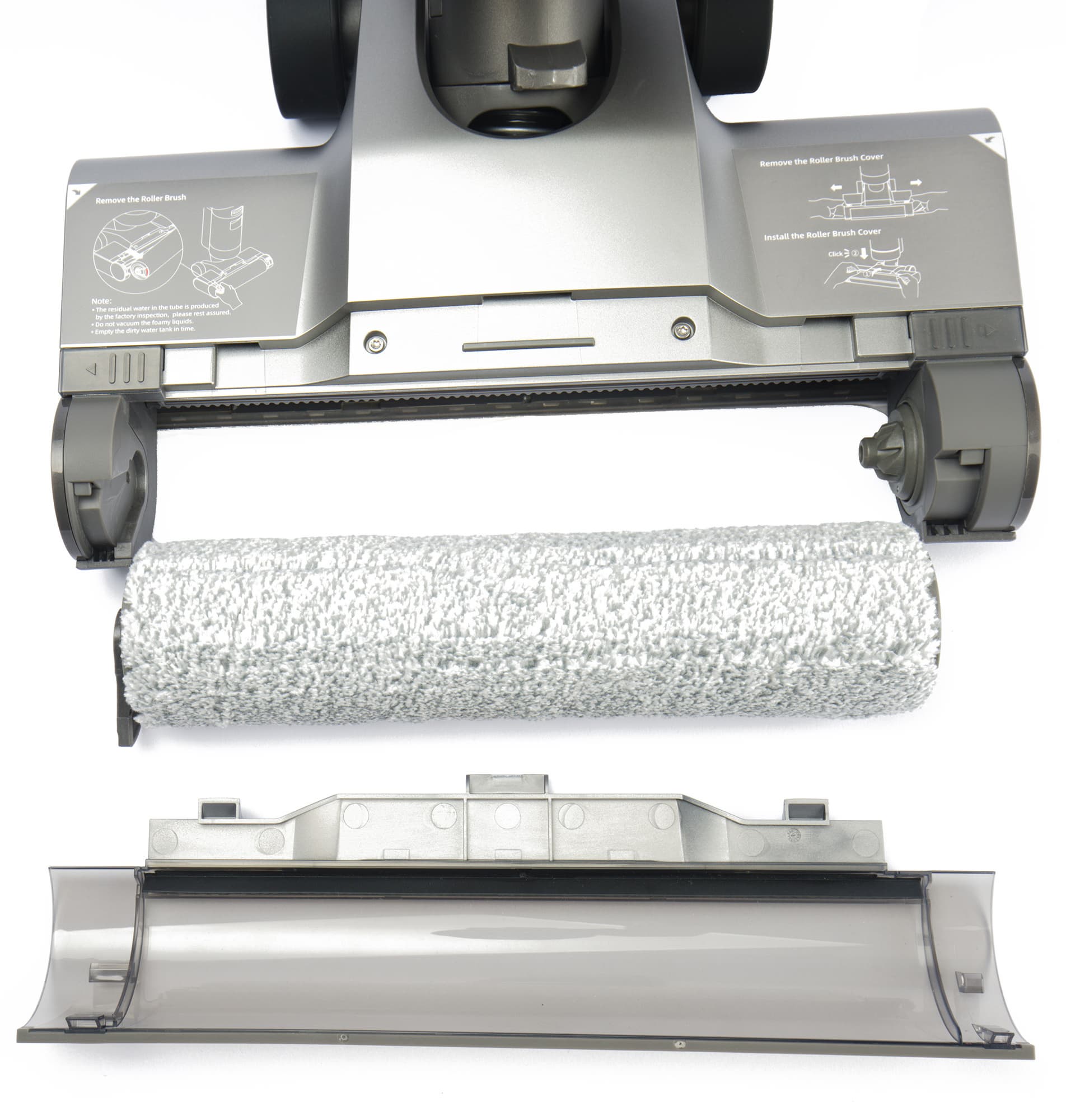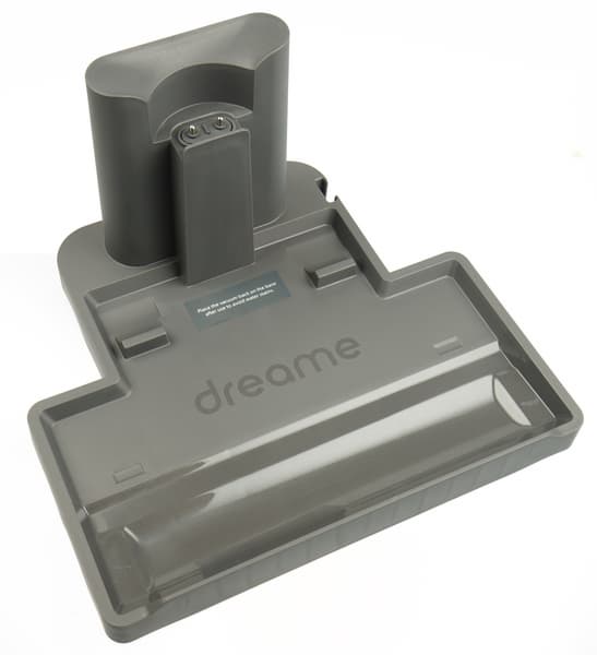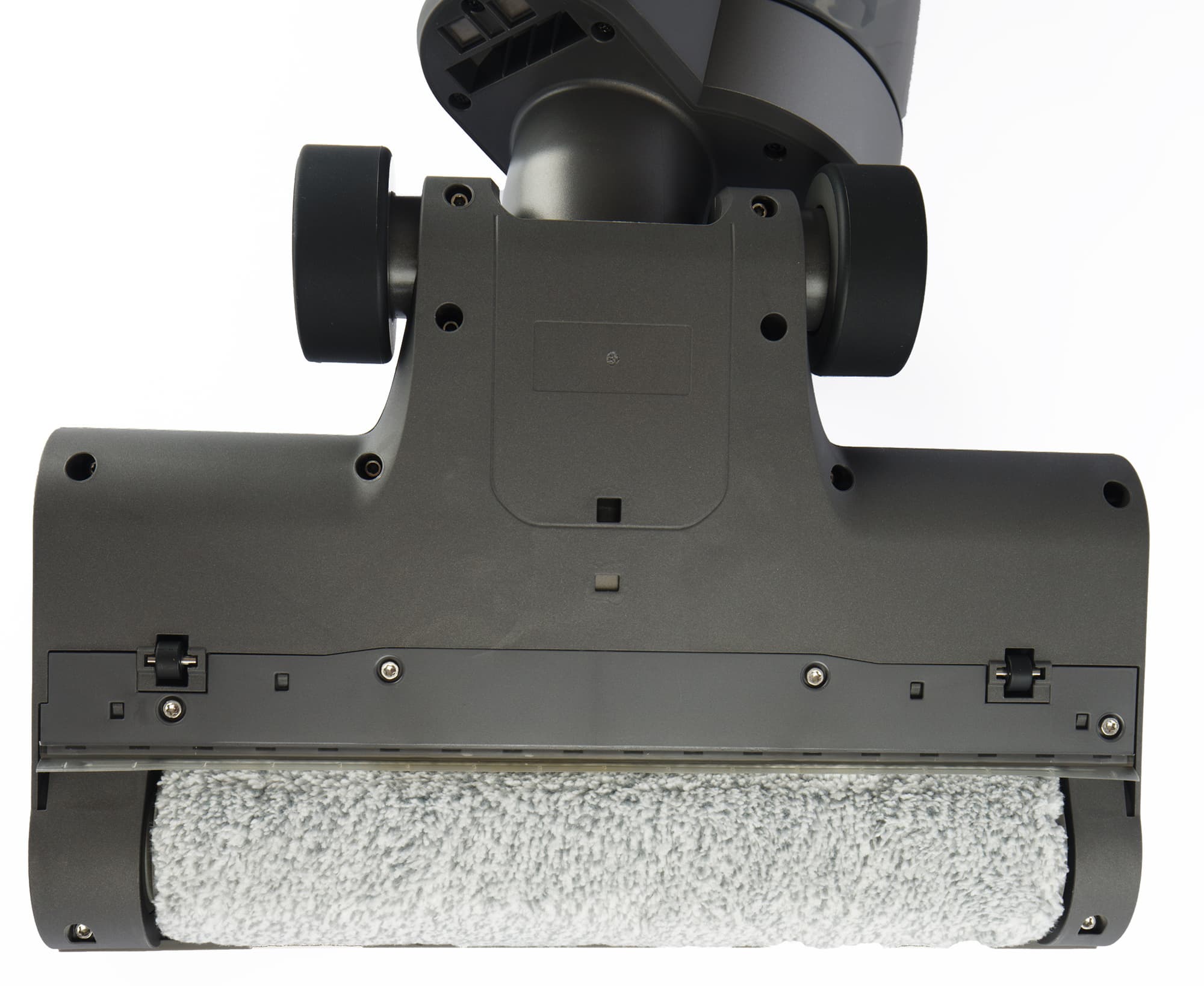 На нижней стороне щетки нет традиционных для «сухих» пылесосов отверстий: воздух и грязная жидкость засасываются внутрь устройства через отсек роторной щетки. Опирается пылесос на два крупных колеса в пяточной части насадки, а два небольших ролика на нижней панели облегчают скольжение прибора по поверхности.