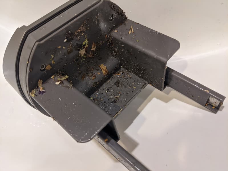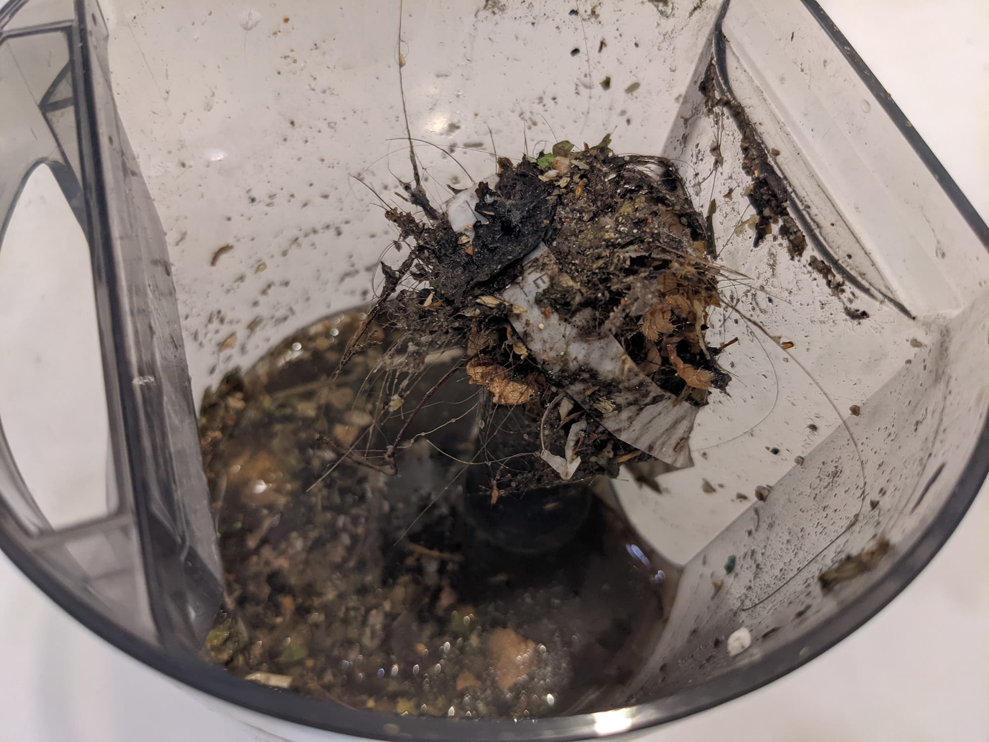 Крупный мусор может собираться в виде внушительной «бороды» на верхнем срезе вертикальной трубки внутри мусоросборника — при сообщении о засорении воздушного тракта в первую очередь стоит смотреть на этот узел.
